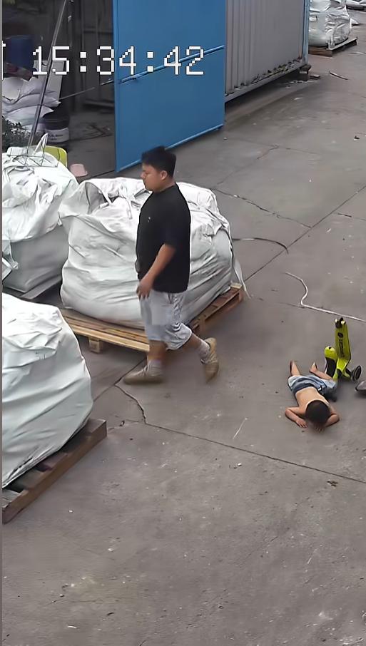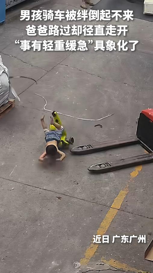 小男孩儿在院子里骑车时,不小心碰到了叉车腿,直接向前摔了个狗啃泥,趴在地上就起不来了。孩子的爸爸看见后,也不着急,淡定的走了过来。