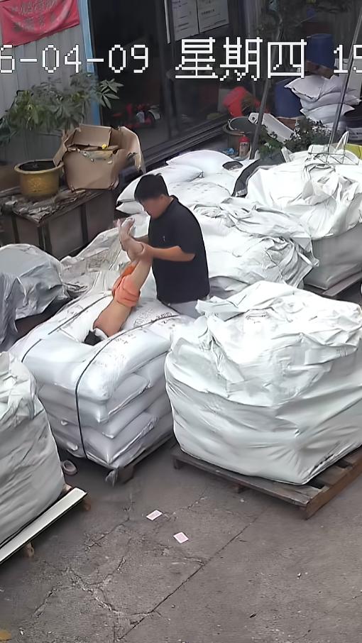 可到了旁边,他竟然没停下,反而直接把孩子略过去了,像旁边对着的材料走去。画面一转,在一托盘材料上,有个小姑娘倒栽进了中间的洞里,就剩了半条腿露在外面,不停地晃荡。