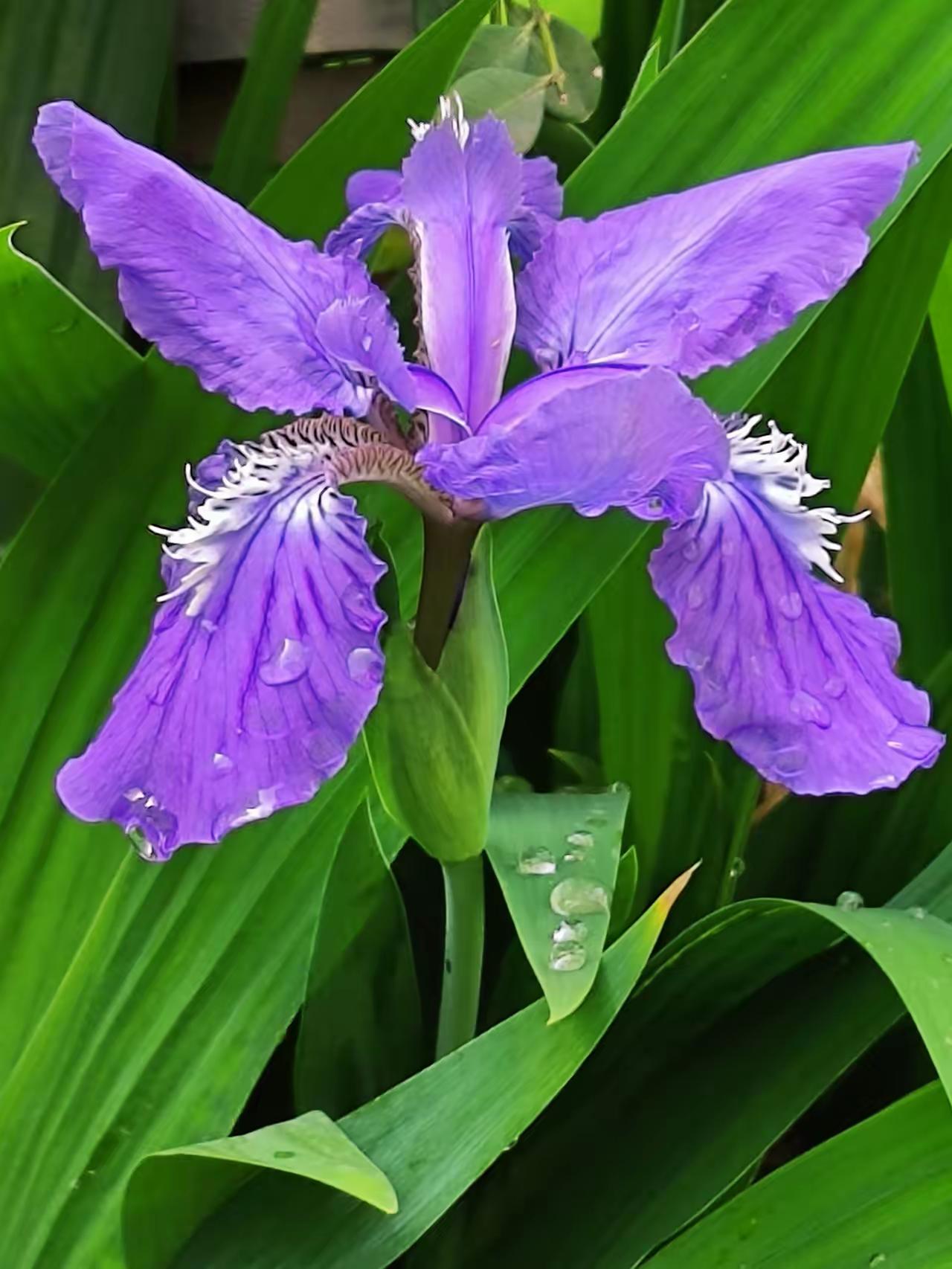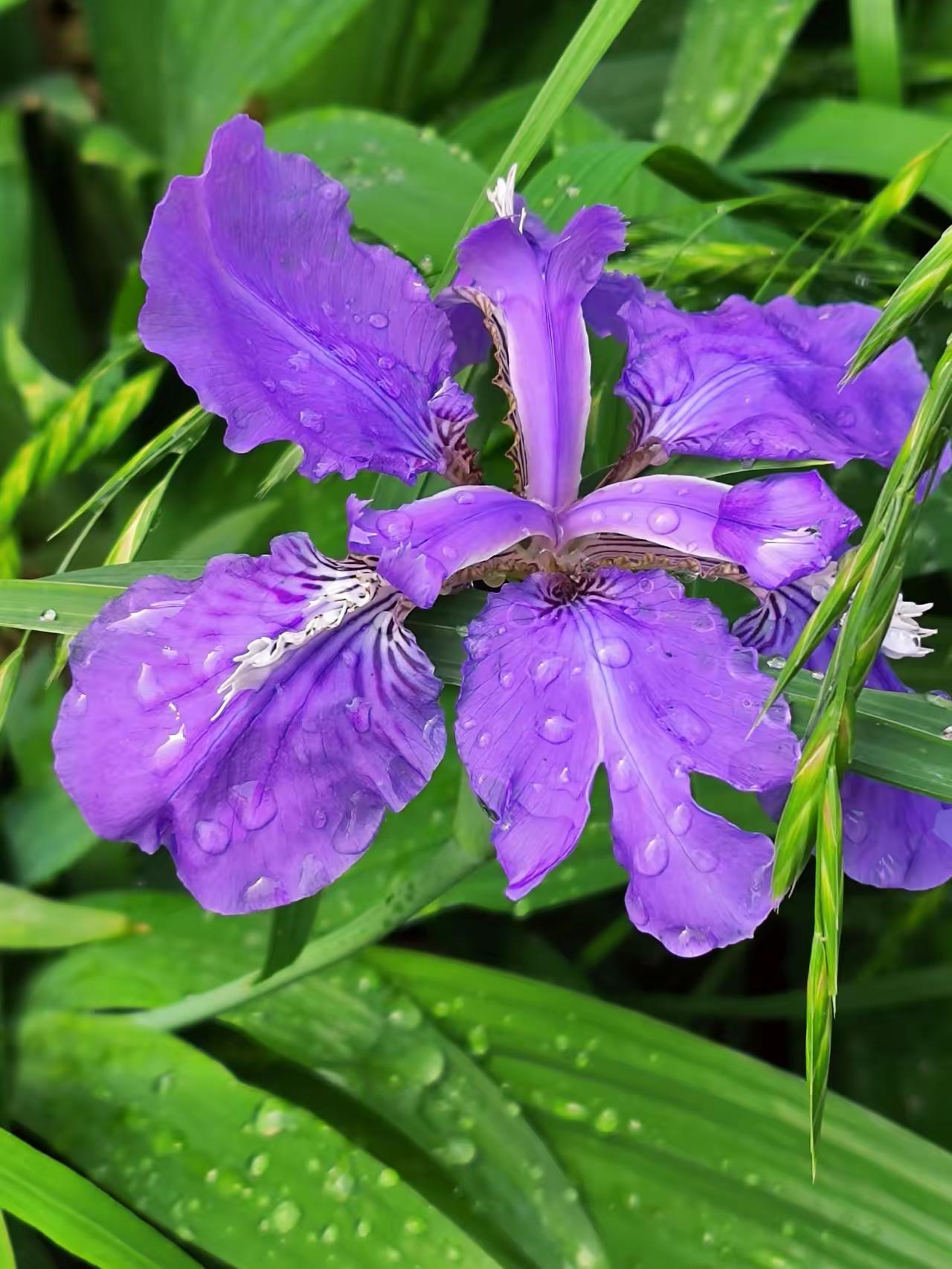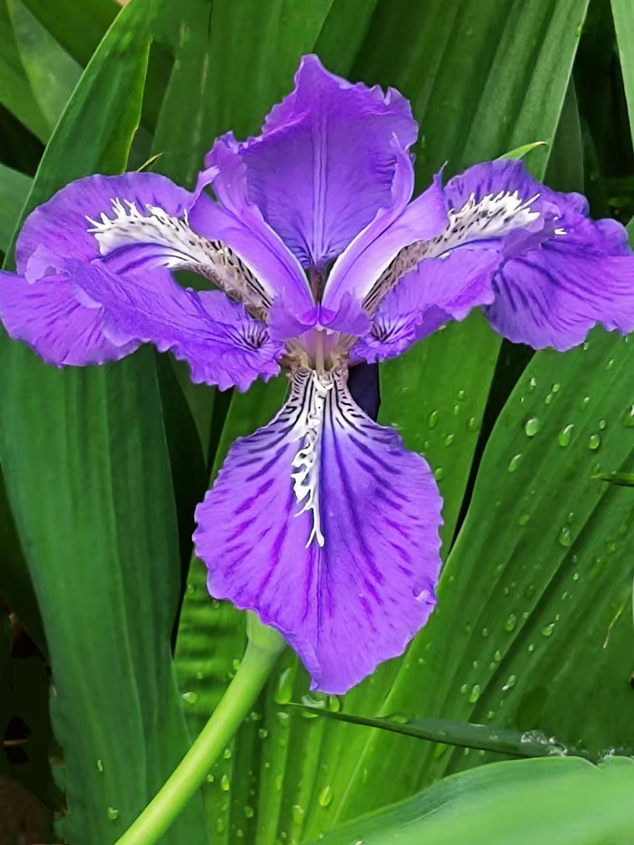 雨后的紫色鸢尾花,花瓣上还挂着晶莹的水珠,在微风中轻轻摇曳,仿佛一群紫色的蝴蝶在翩翩起舞。那抹紫色,在雨后的清新空气中显得格外耀眼,像是一幅生动的画卷,让人忍不住驻足观赏。