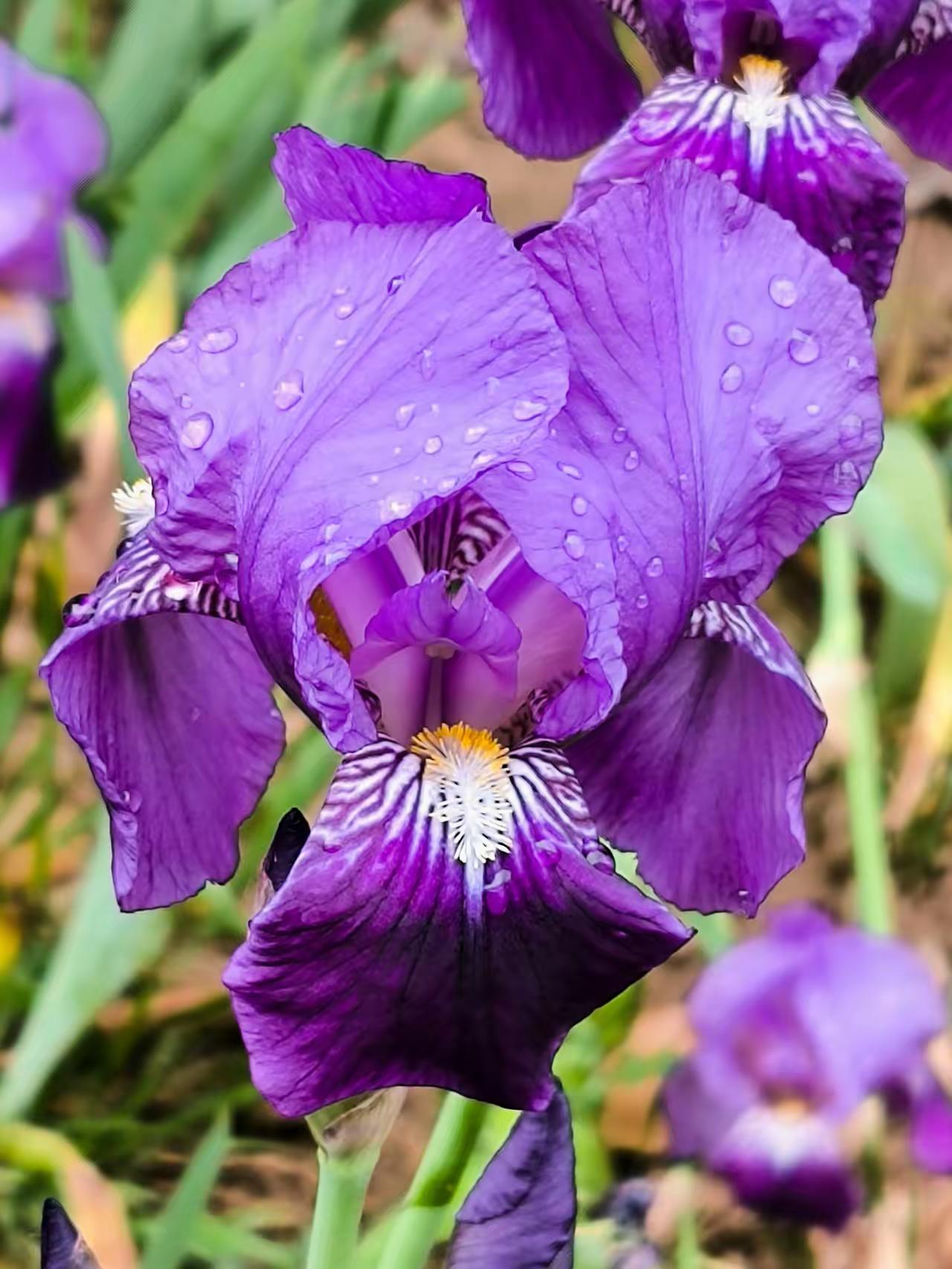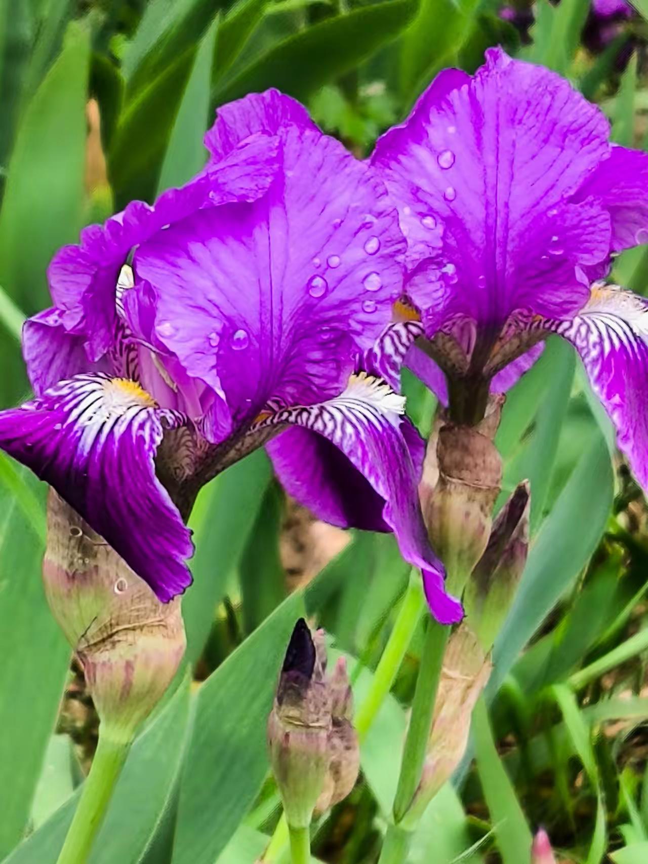 雨后的紫色鸢尾花,花瓣上还挂着晶莹的水珠,在微风中轻轻摇曳,仿佛一群紫色的蝴蝶在