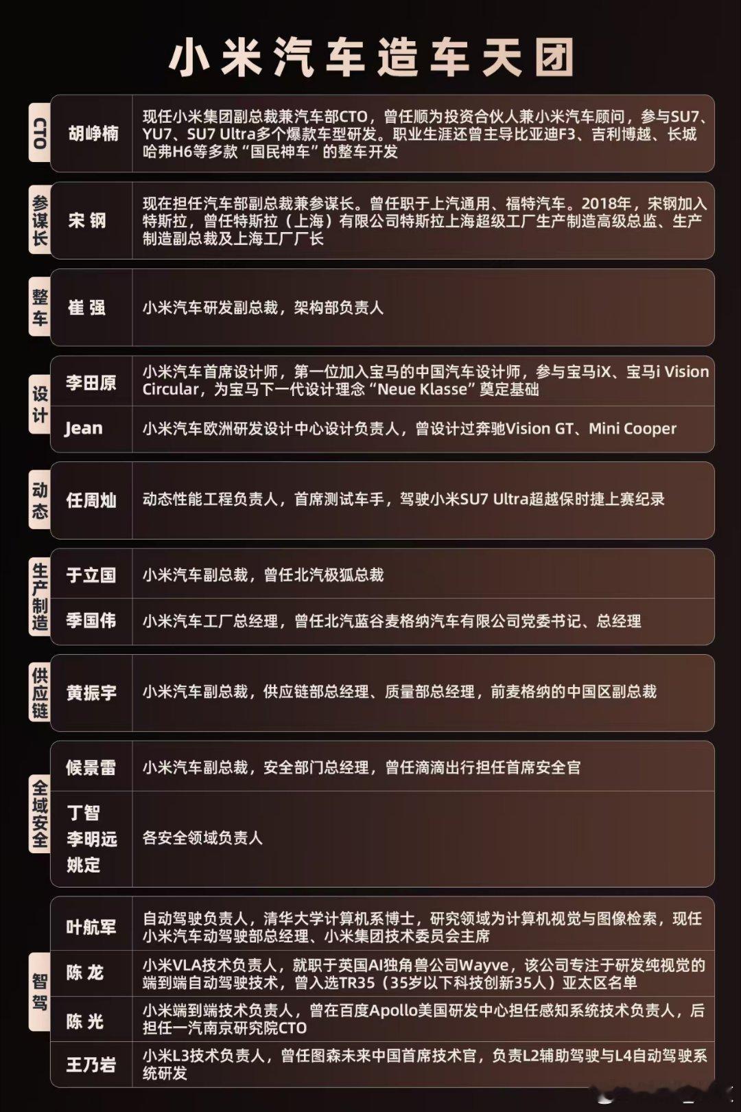 胡峥楠出任小米集团副总裁小米汽车“最强造车天团”再添猛将!胡峥楠、宋钢两位行业顶尖技术、管理人才重磅加盟,加上此前的侯景雷、李田原等资深大佬,战略、研发、制造各条线均配置顶级班底。目前小米汽车团队超万人,近九成都是研发人员,还在欧洲引入大量国际化人才。SU7、YU7接连爆火后,小米正全面升级工业级专业体系,加速向世界级成熟车企迈进,让用户选车也更踏实。
