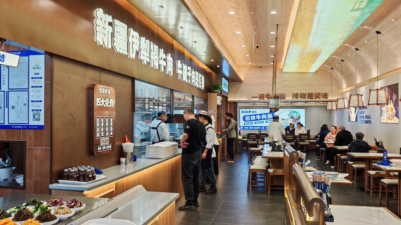 更贴心的是,醒目位置贴着一张宣传单四项免费:免费续面,免费姜茶,免费加汤,免费喝粥。