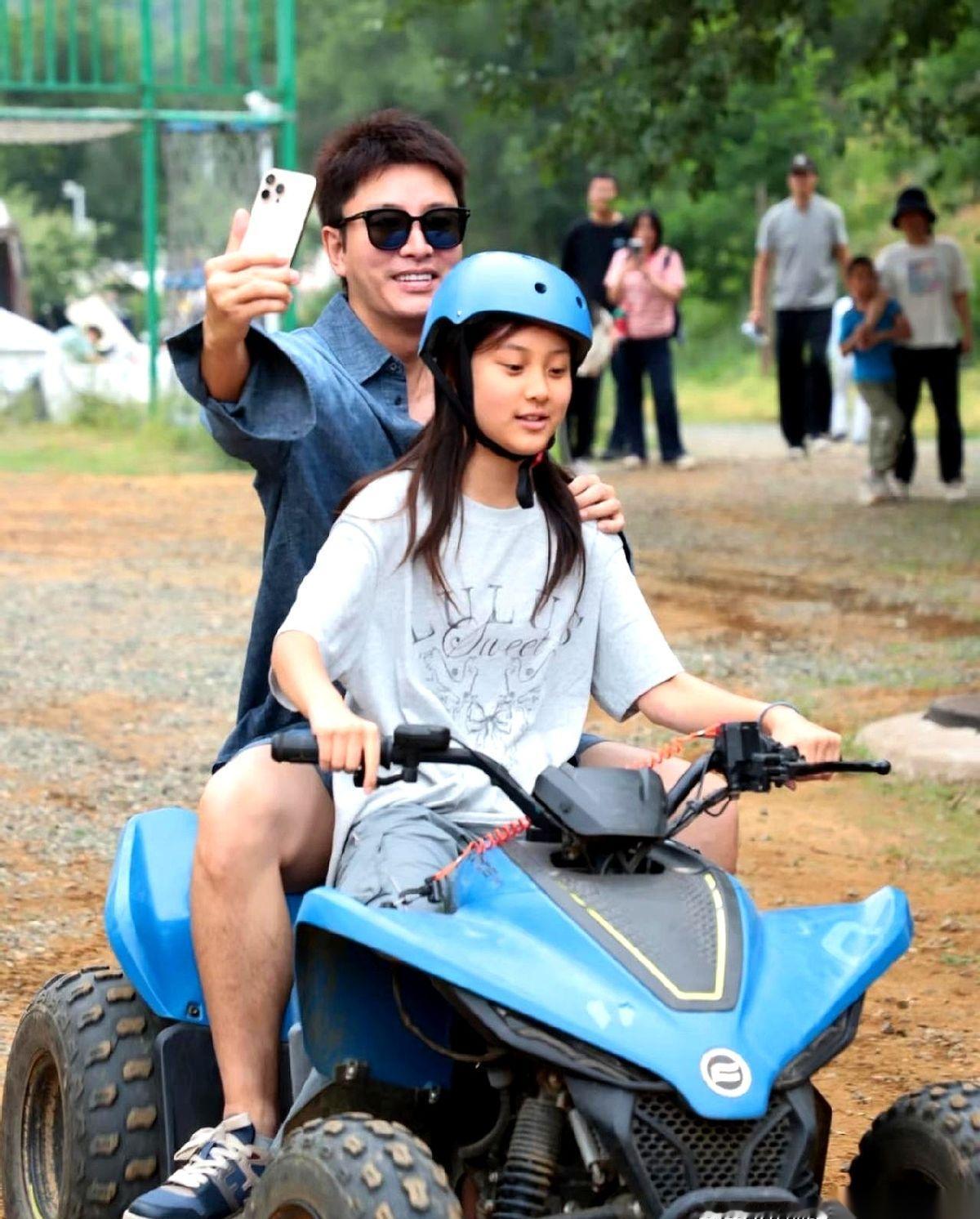 13岁的姑娘,个头疯长,往爸爸身边一站,肩膀已经快齐平了,目测身高直逼1米65。她没穿什么大牌,也没化精致的妆,就一件极其普通的深蓝色T恤,头发在脑后随手扎了个低马尾,清爽得像个邻家女孩。
