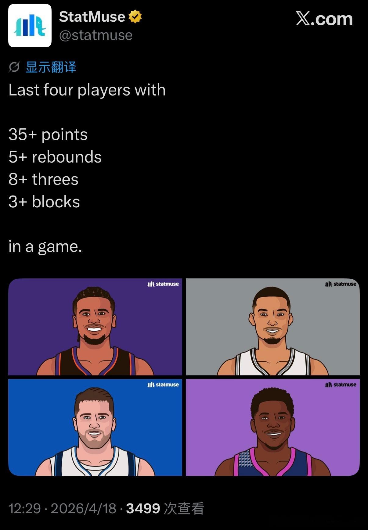 单场比赛能够得分35+篮板5+三分8+封盖3+的四位球员: