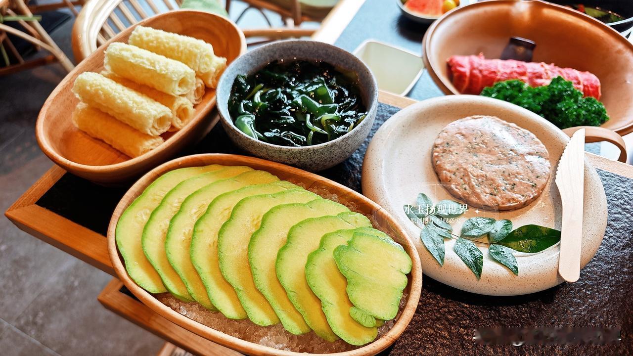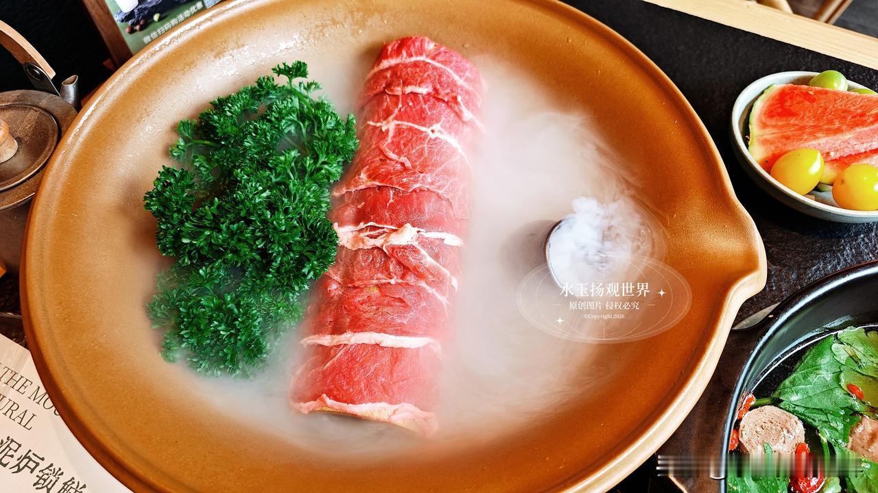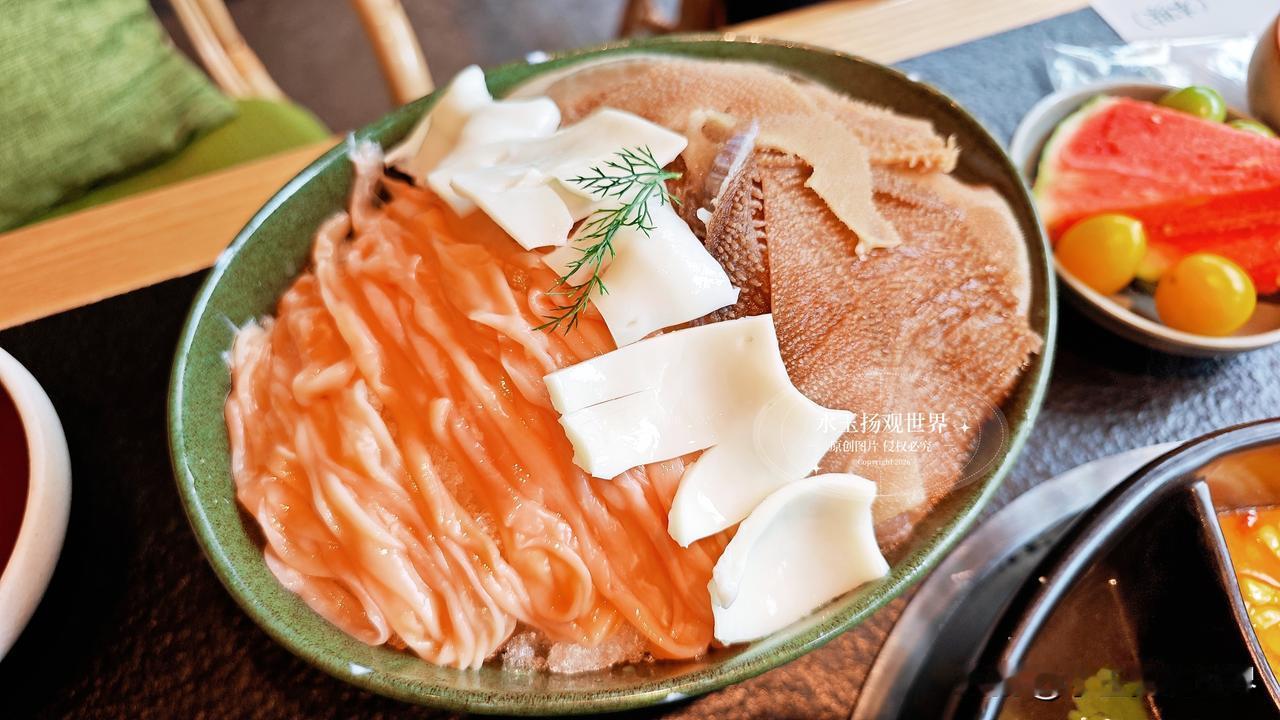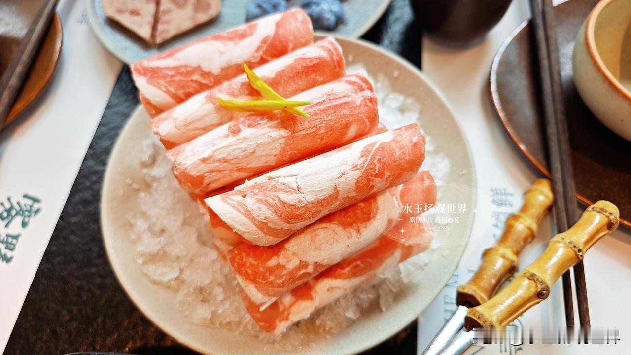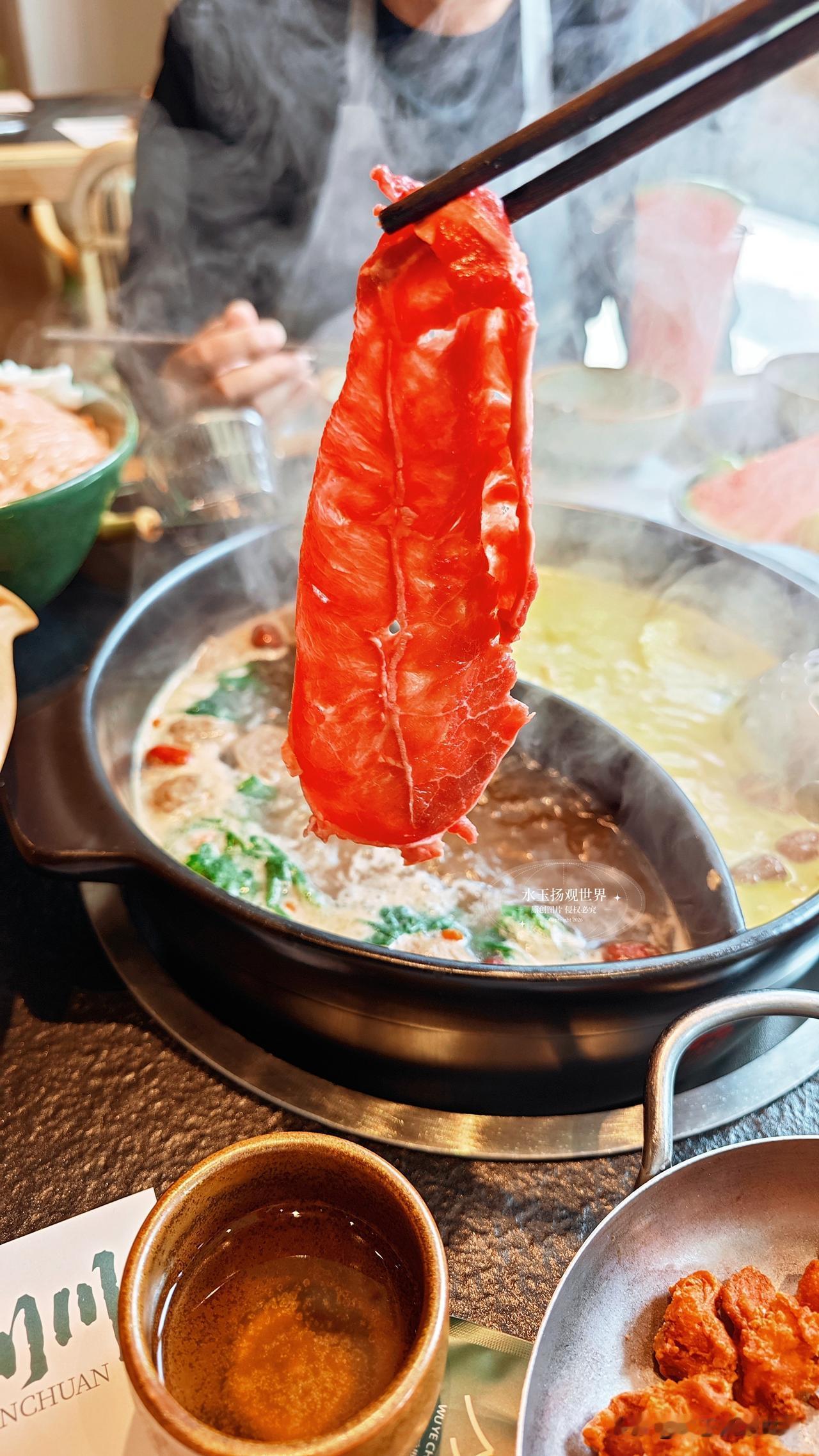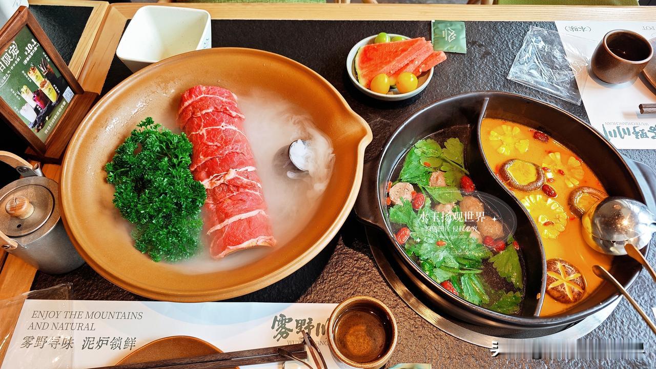 坐下来先点了双拼锅底,野果酸汤配牛油辣,酸汤里飘着野果干,闻着就开胃,牛油锅的香气直钻鼻腔,泥炉慢炖的好处就是能把汤底的香味熬得透透的,服务员小姐姐特别贴心,主动给我们倒了免费的五宝茶,还送了应季果盘,这细节真的太加分了,不像有些店一坐下就催着点菜,这里的节奏慢悠悠的,让人很舒服。先涮九秒牛肉,端上来的时候仙气飘飘,肉片薄得透光,纹理像盛泽的丝绸一样细腻,小姐姐说涮九秒刚好,我试着烫了一下,入口嫩得像豆腐,一点不柴,蘸上自己调的干碟,麻辣鲜香在嘴里炸开,我当场就跟朋友说这牛肉真的绝了,比我在成都吃的还要嫩。鲜切吊龙也不能错过,师傅现切现摆,肉的颜色鲜红透亮,拎起来还能看到汁水往下滴,放进锅里涮几秒,嚼在嘴里满是牛肉的奶香,配着酸汤解腻,一口接一口根本停不下来,我真的怀疑老板是不是在牛肉上有什么独家秘方,怎么能这么新鲜。