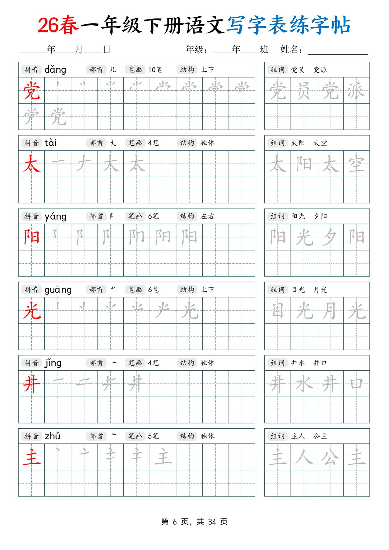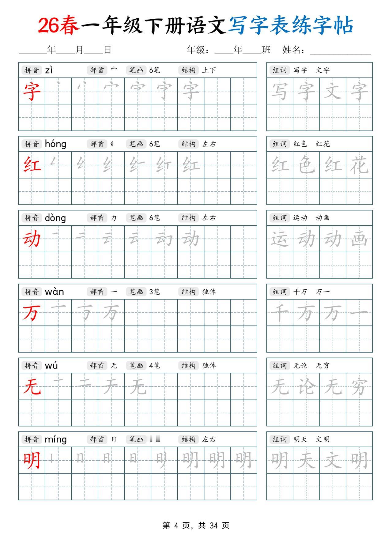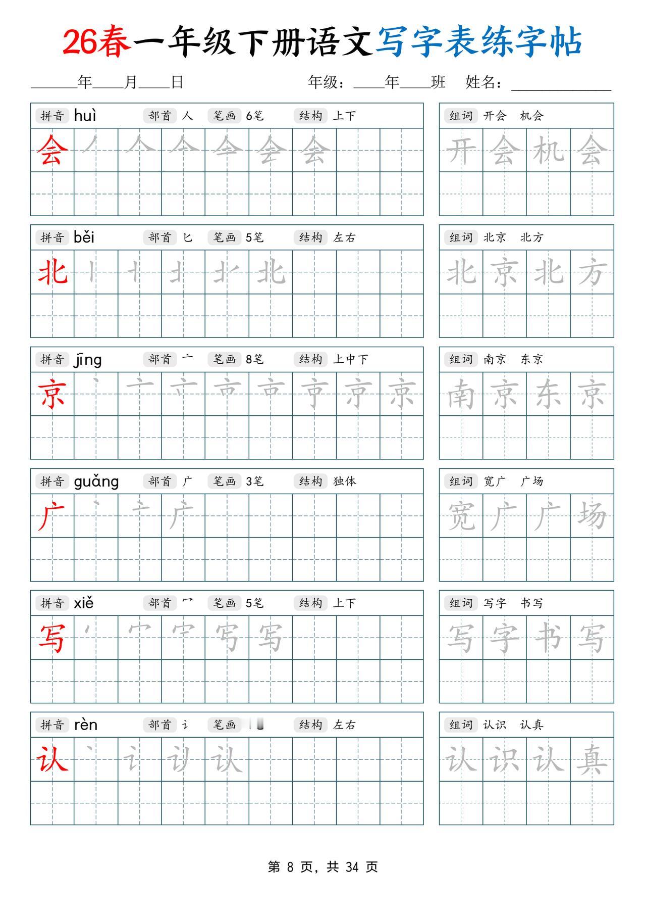 26春一年级下册语文写字表练字帖(生字拼音笔顺组词)34页,收藏备用