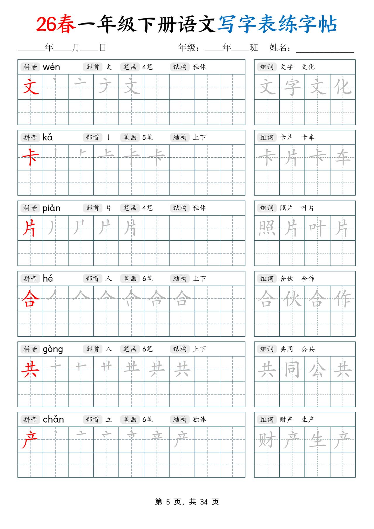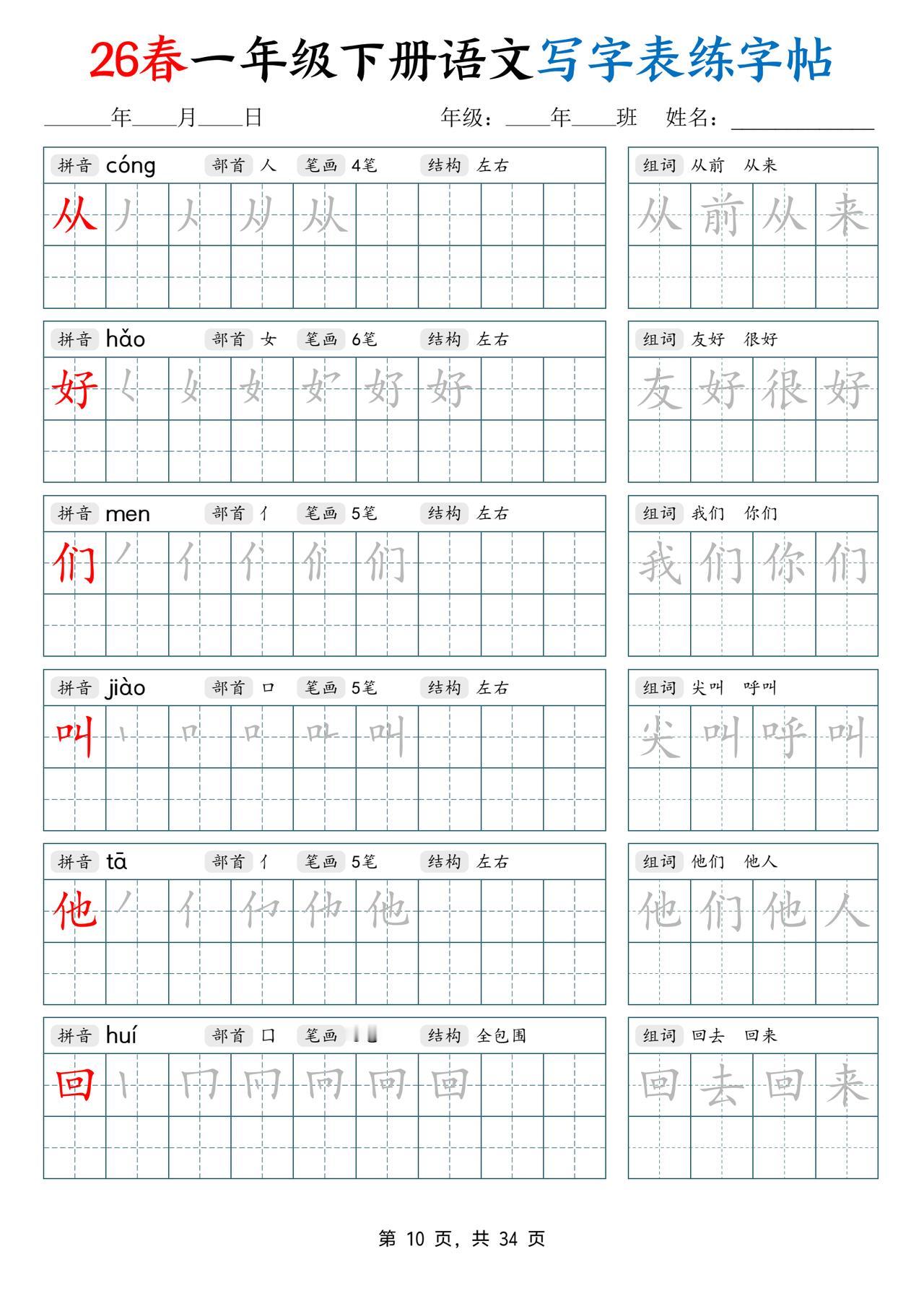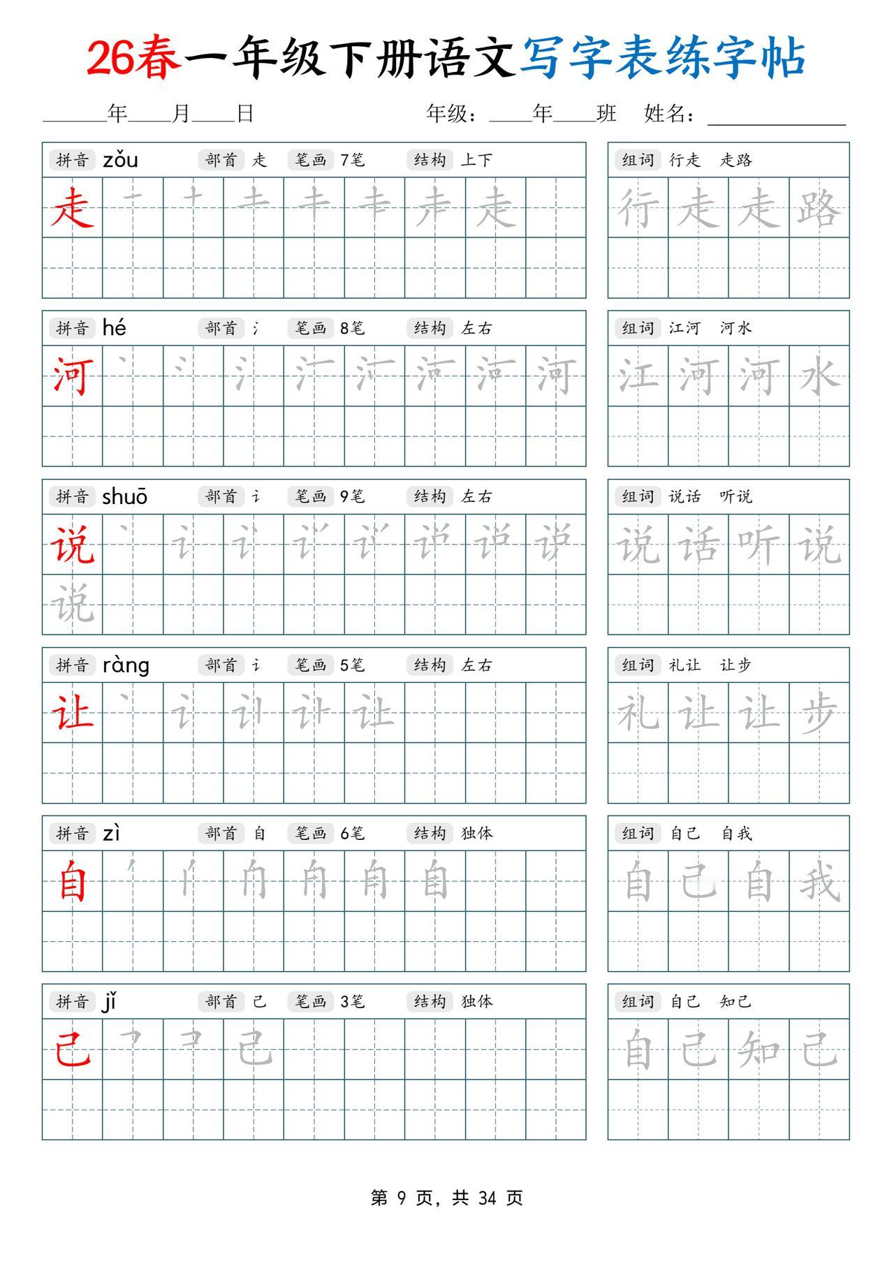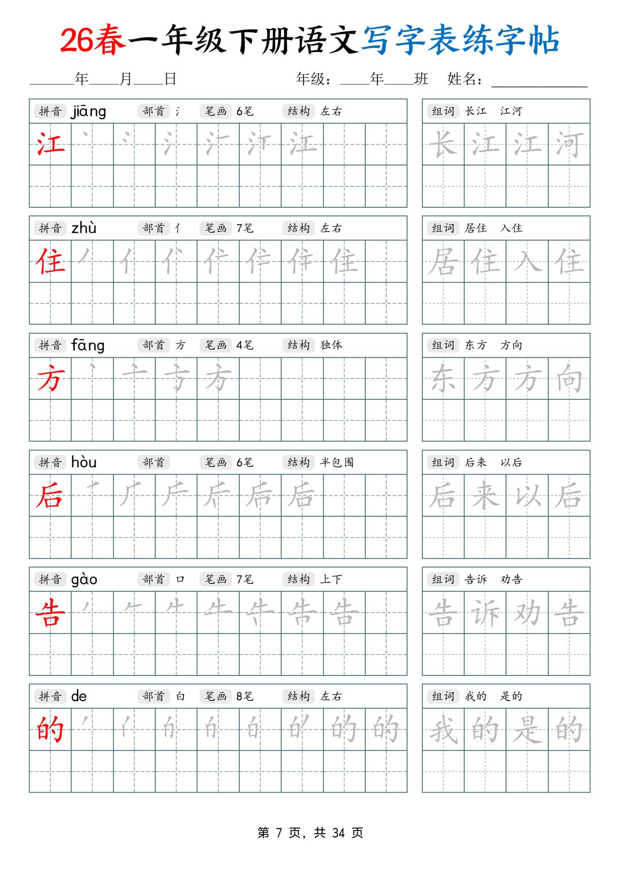 26春一年级下册语文写字表练字帖(生字拼音笔顺组词)34页,收藏备用