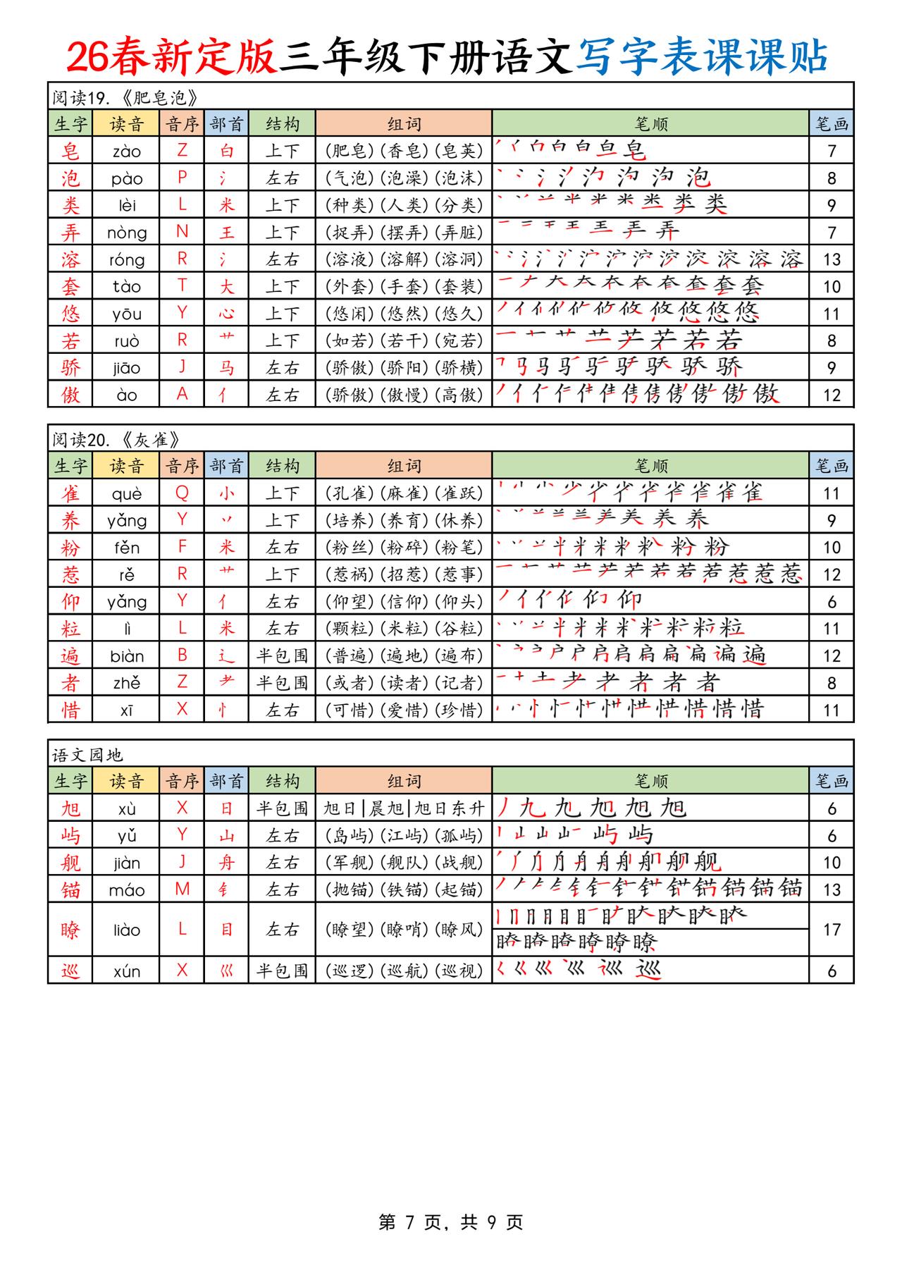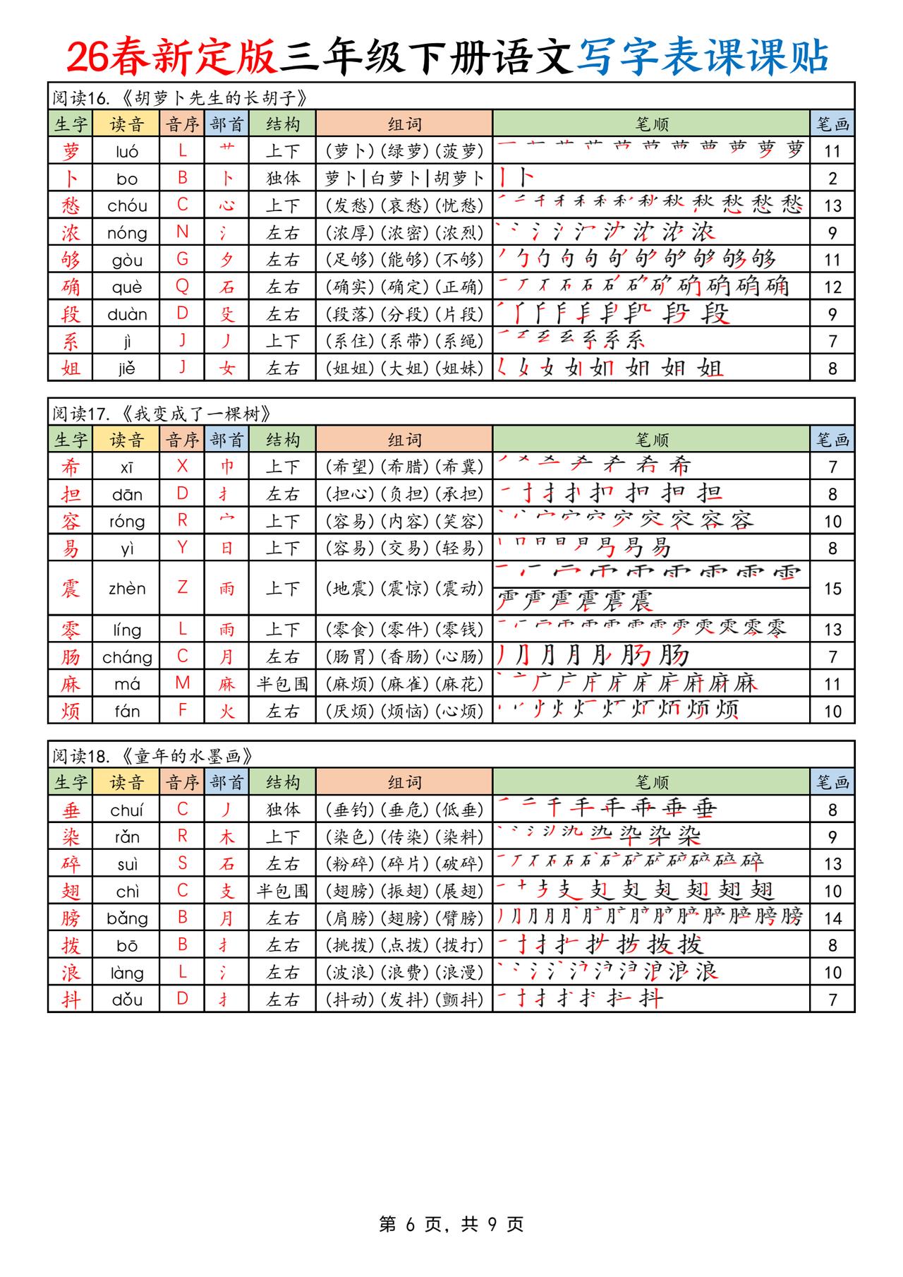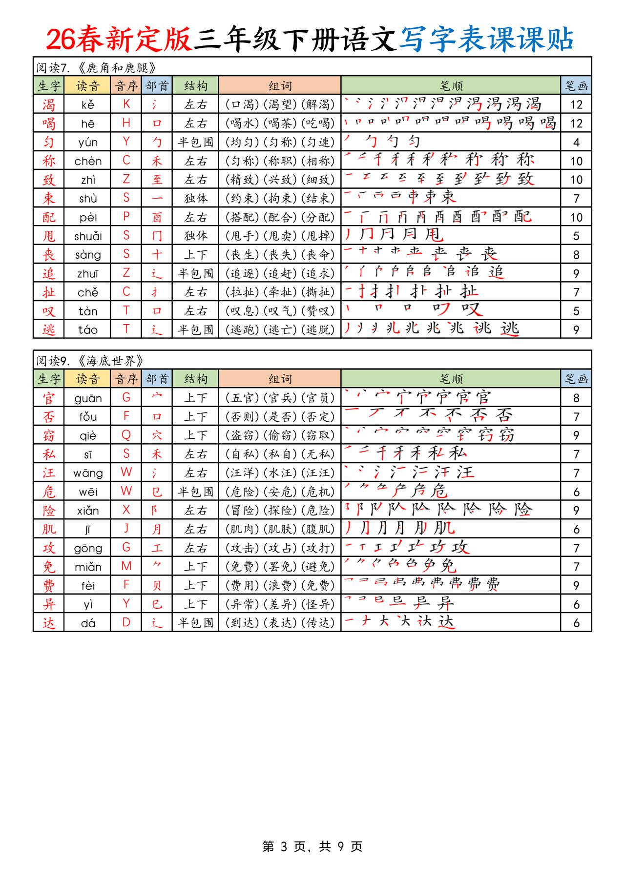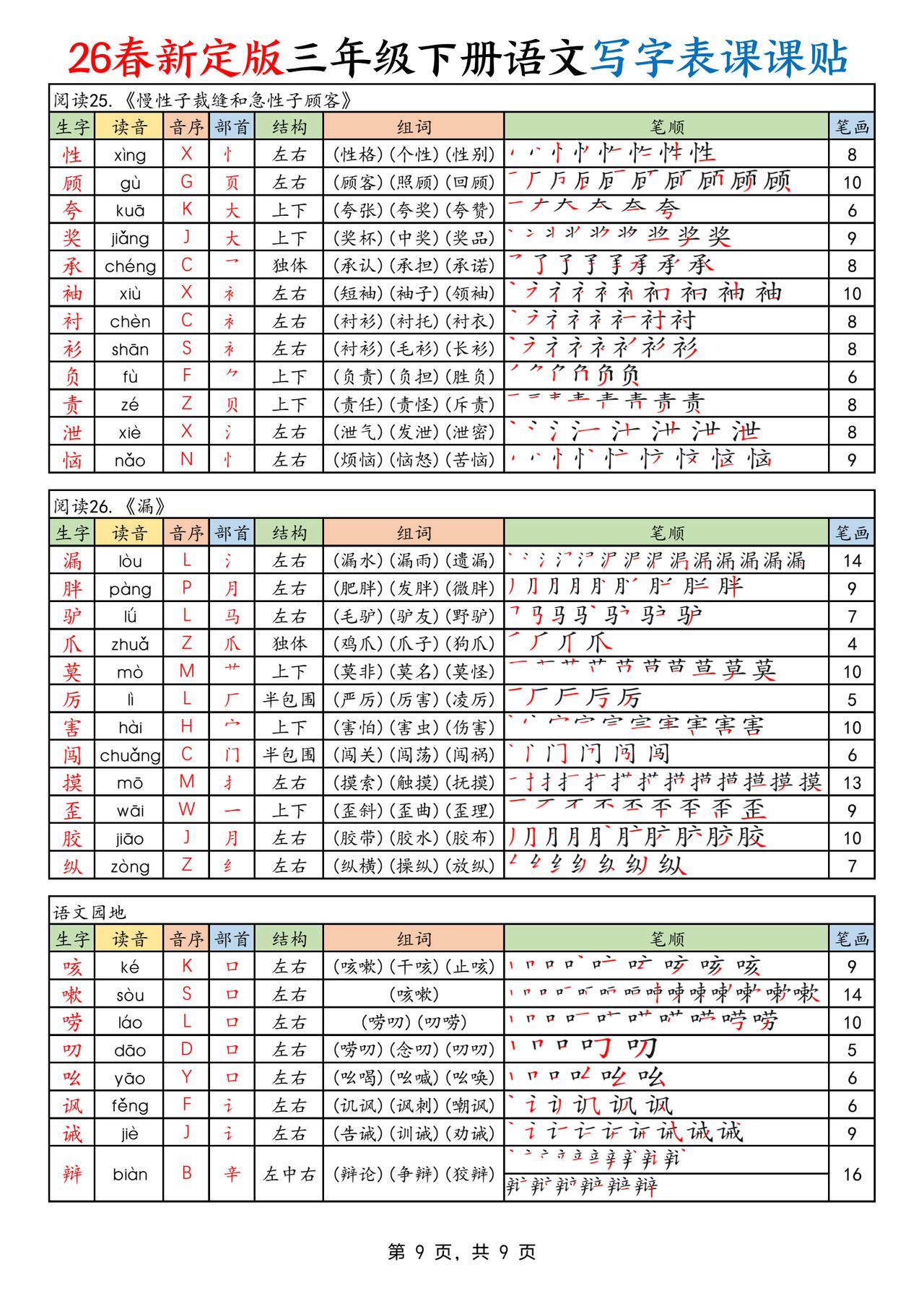 26春三年级下册语文写字表课课贴(250字)9页,收藏备用