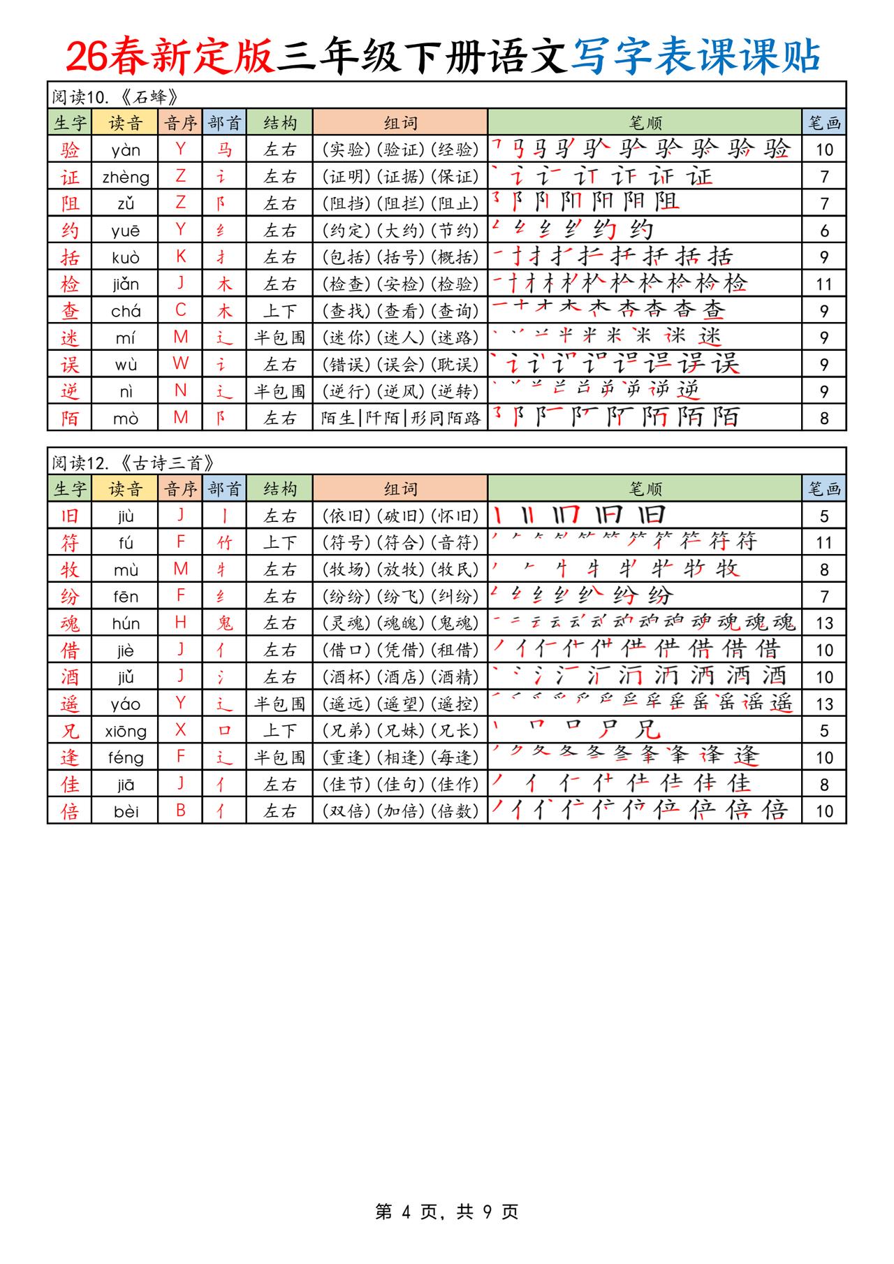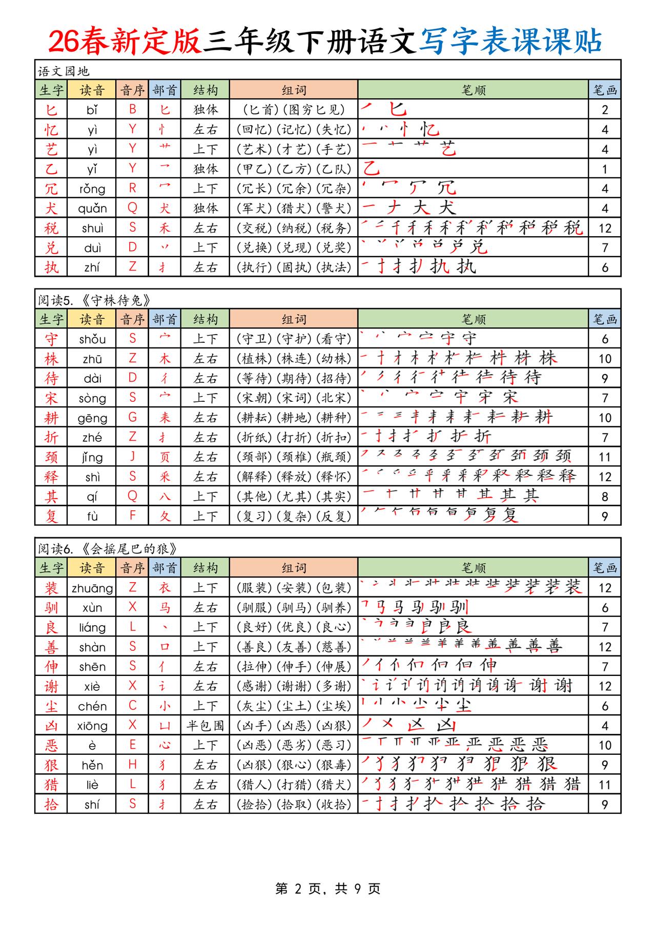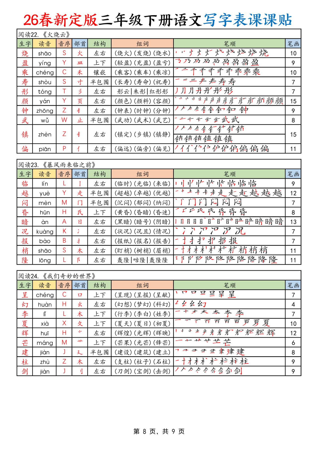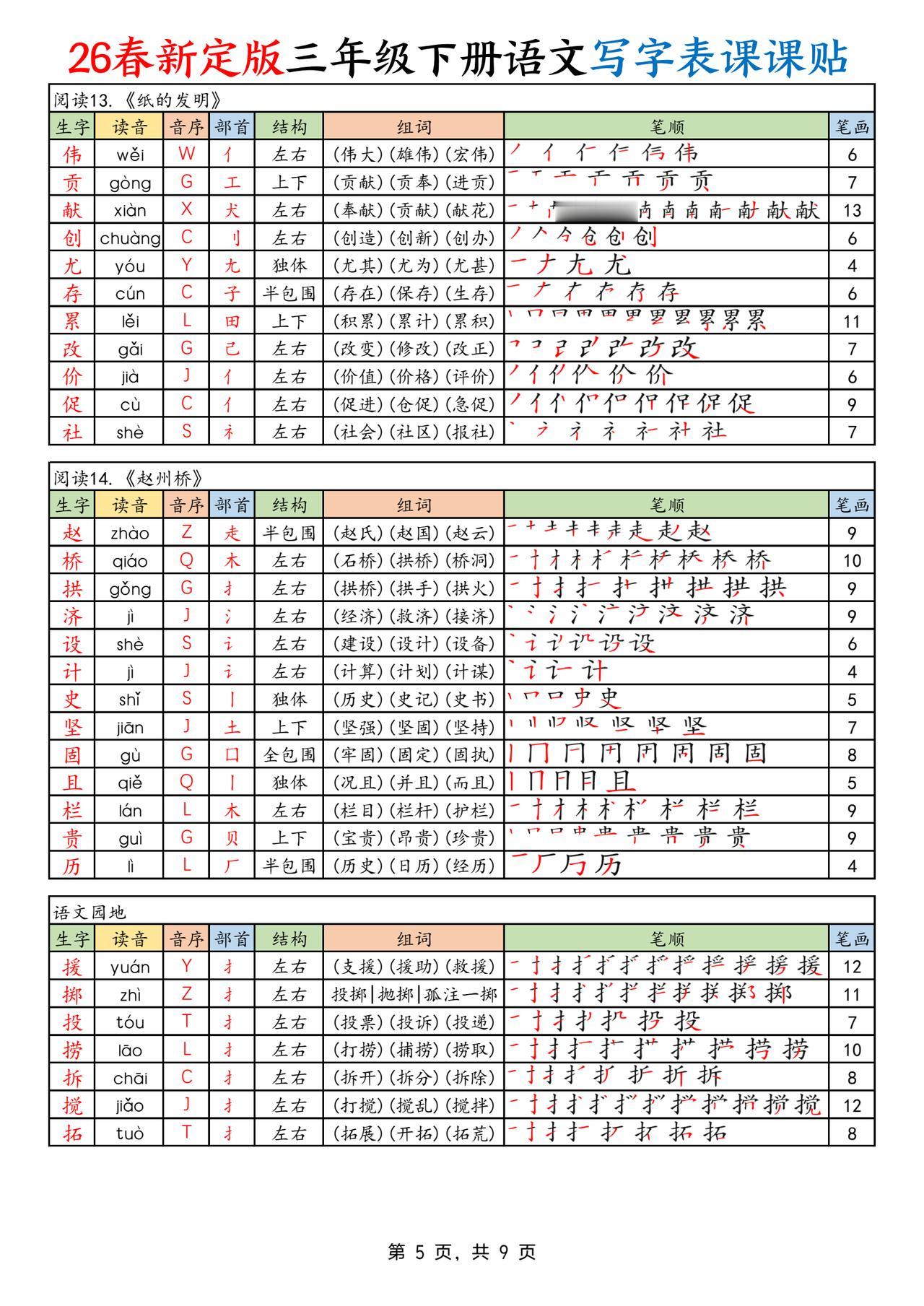 26春三年级下册语文写字表课课贴(250字)9页,收藏备用