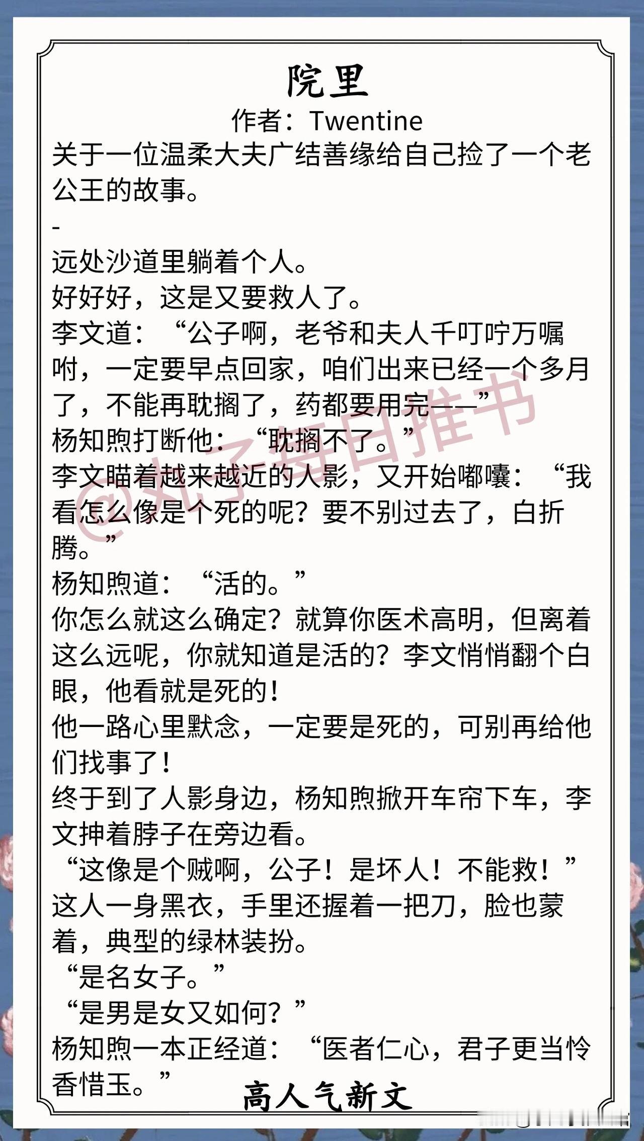 4. 《院里》作者:Twentine(冷面女杀手vs病弱男大夫,双休救赎,古风言情)