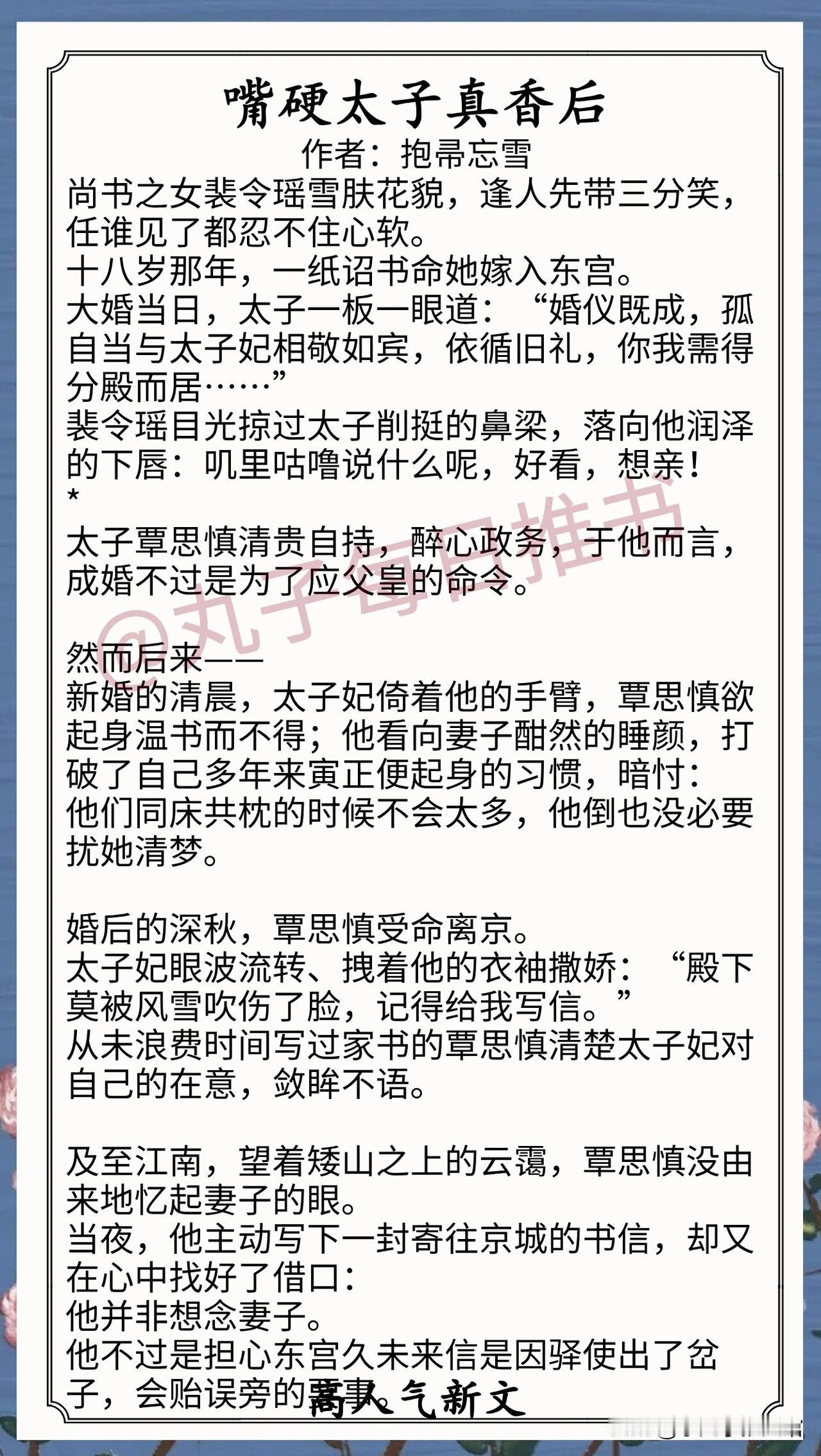 8. 《嘴硬太子真香后》作者:抱帚忘雪(直球小太阳vs嘴硬死装哥,少年夫妻,先婚后爱,古言小甜饼)