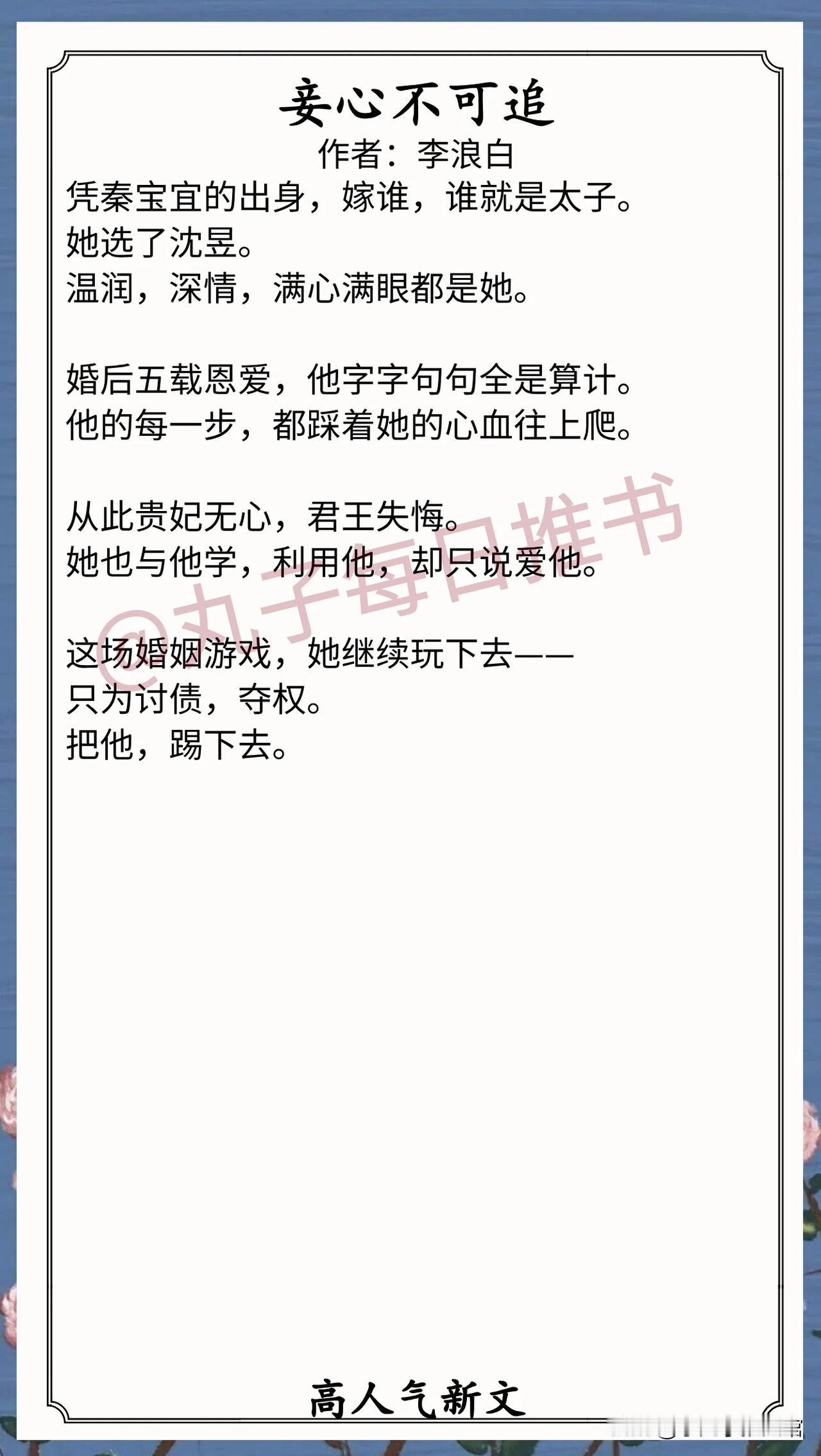 7. 《妾心不可追》作者:李浪白(聪慧将门之女vs镇北王世子,手撕渣男,复仇虐渣,前任扬灰)