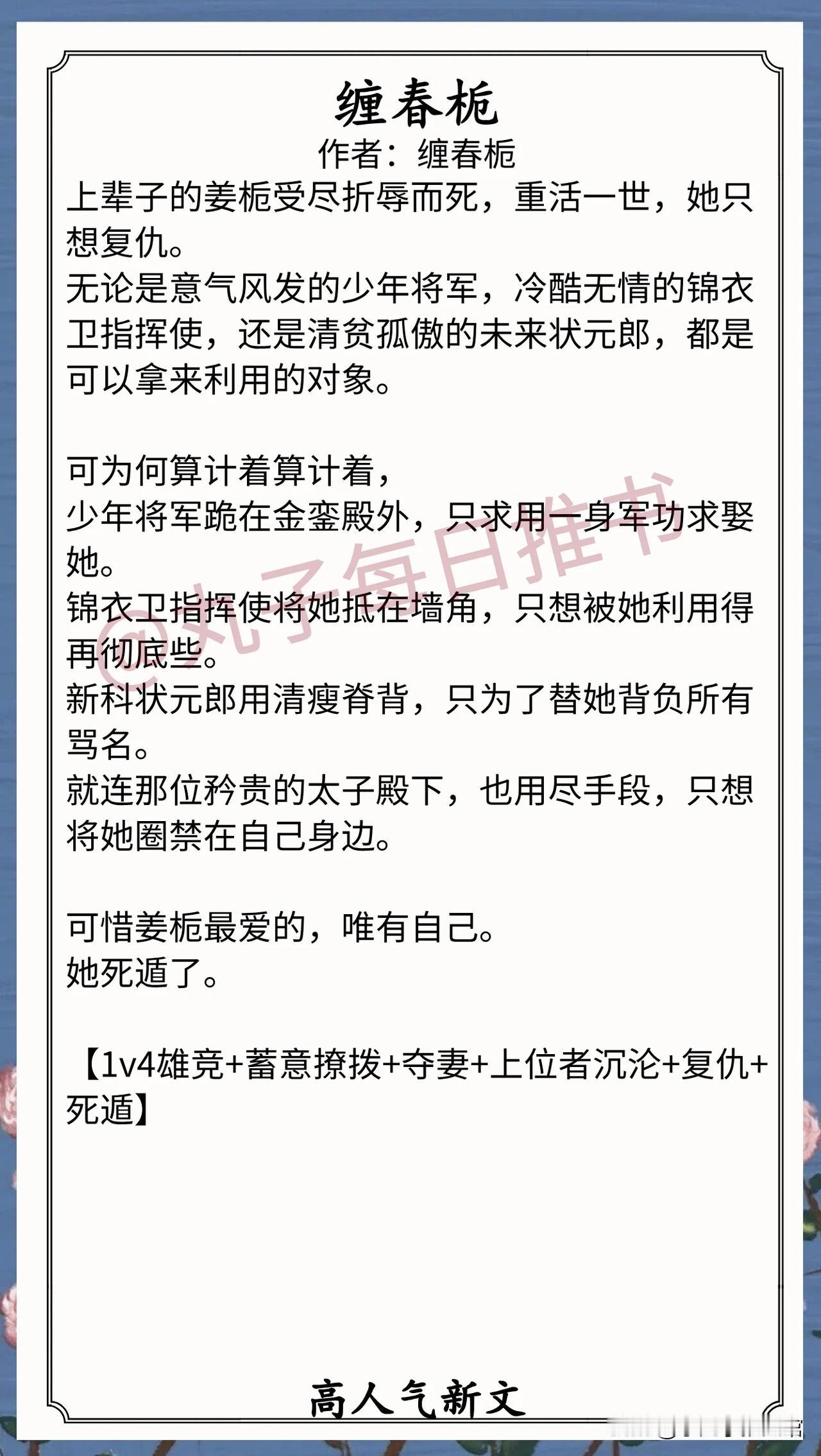 9. 《缠春栀》作者:缠春栀(心机美人,重生,复仇向,蓄意撩拨,上位者沉沦,1v4雄竞)小说 推文