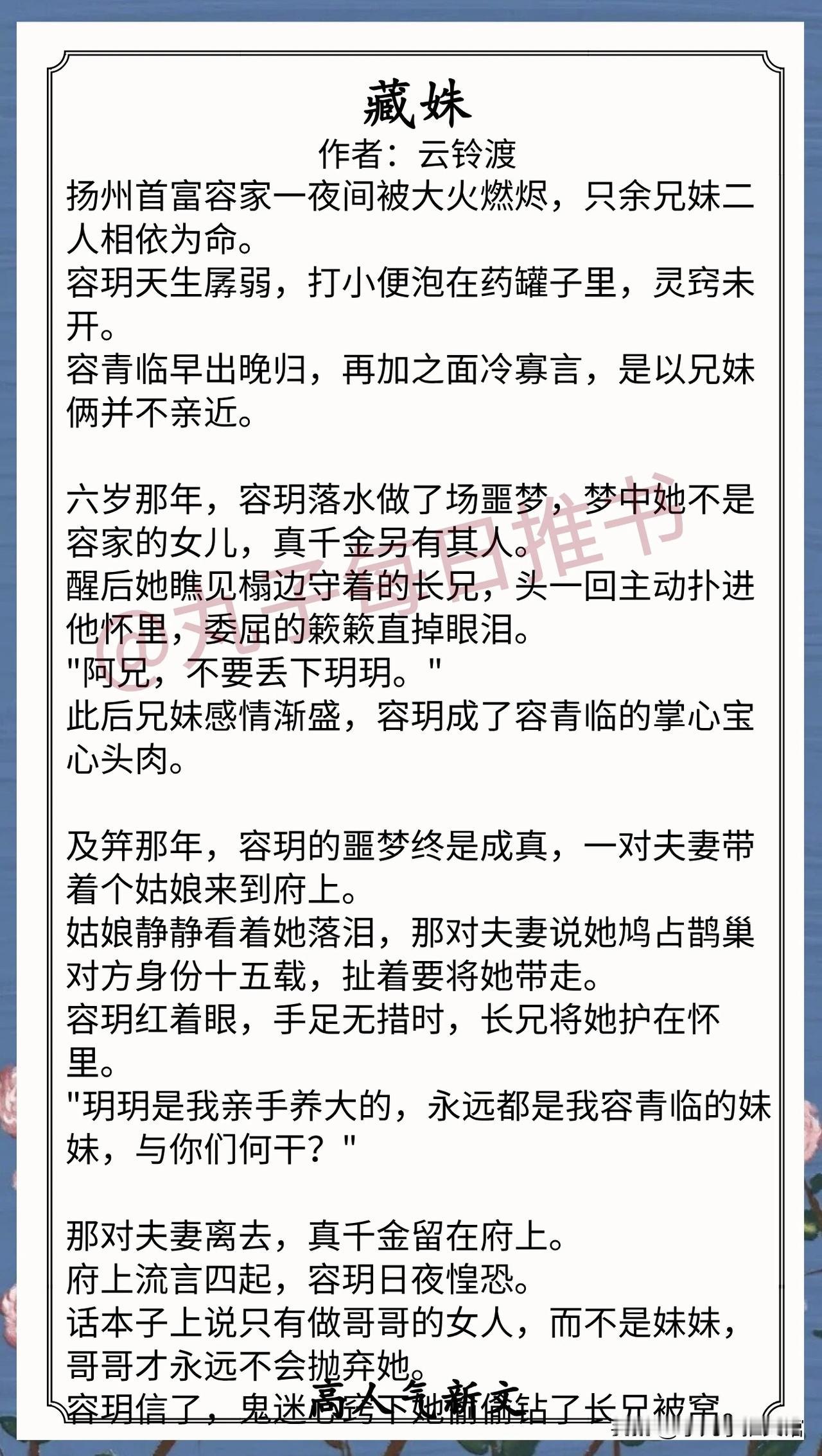 6. 《藏姝》作者:云铃渡(娇软懵懂妹宝vs温柔爹系兄长,伪骨科,高道德者隐忍破戒)