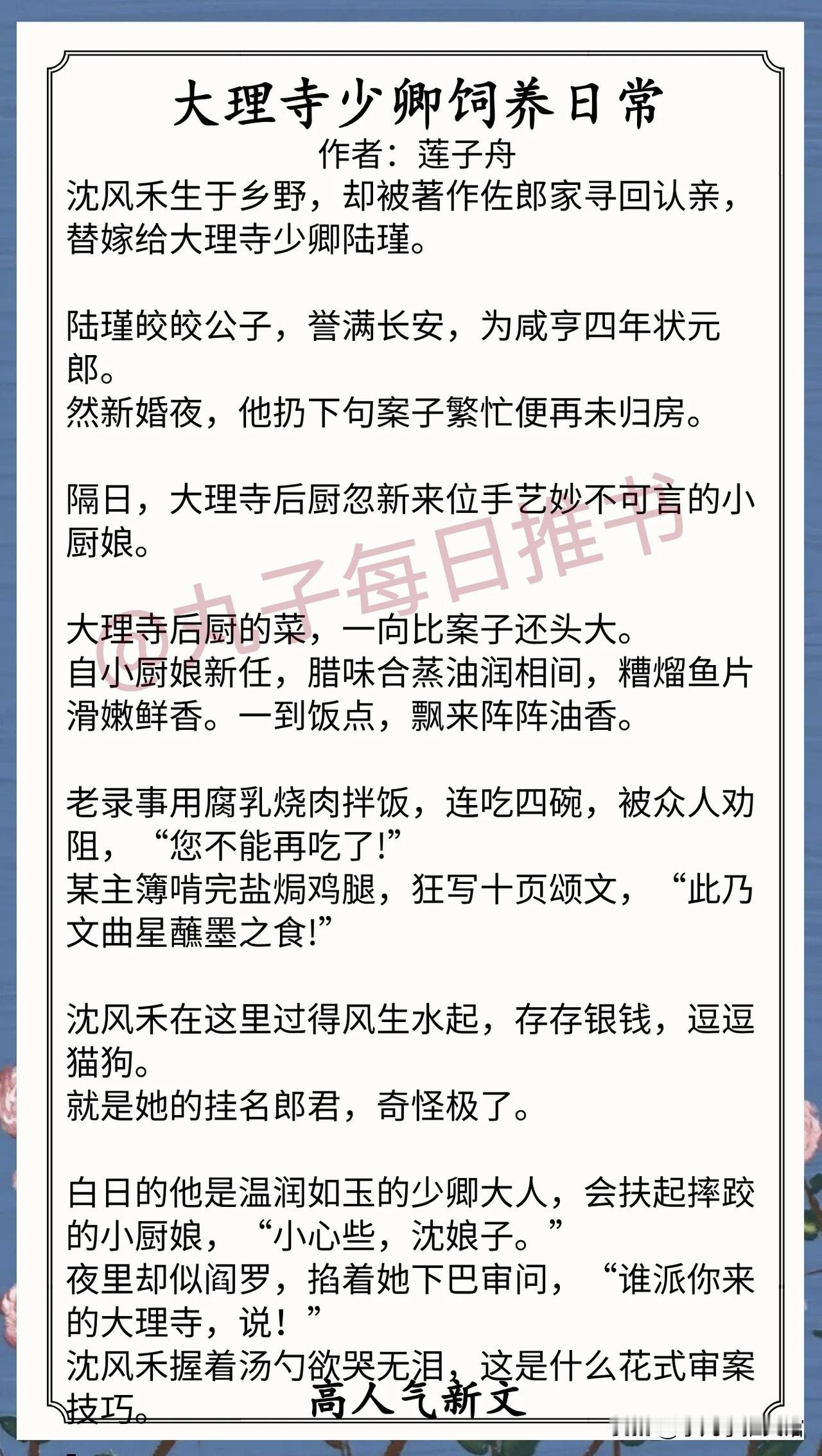 3. 《大理寺少卿饲养日常》作者:莲子舟(明媚小厨娘vs双重人格少卿,替嫁,先婚后爱,美食探案,甜宠日常)