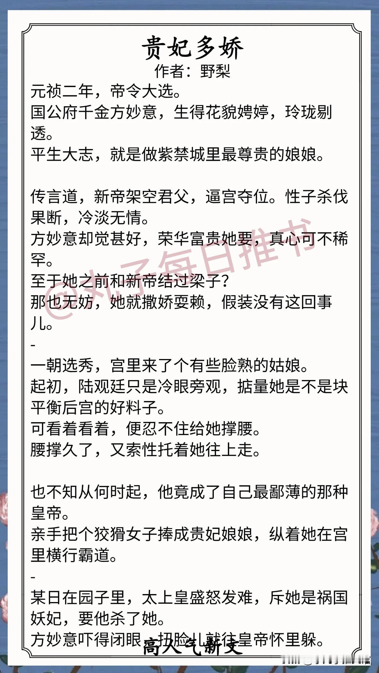 5. 《贵妃多娇》作者:野梨(娇俏会撒娇美人vs冷淡无情帝王,真香,宫斗,男宠女)