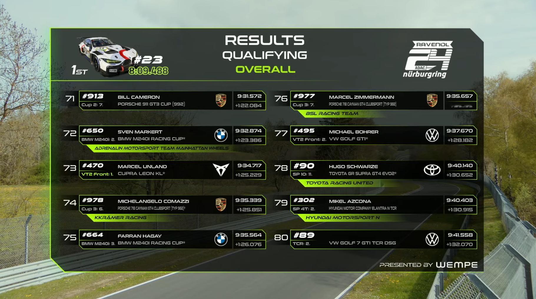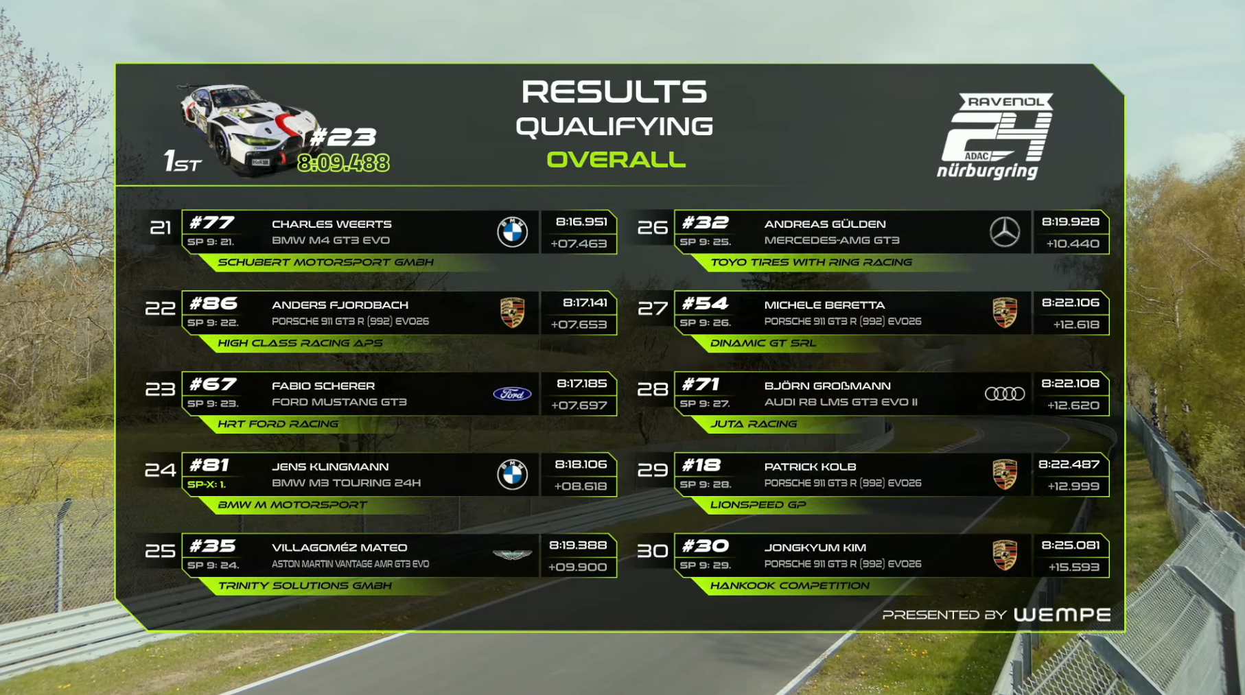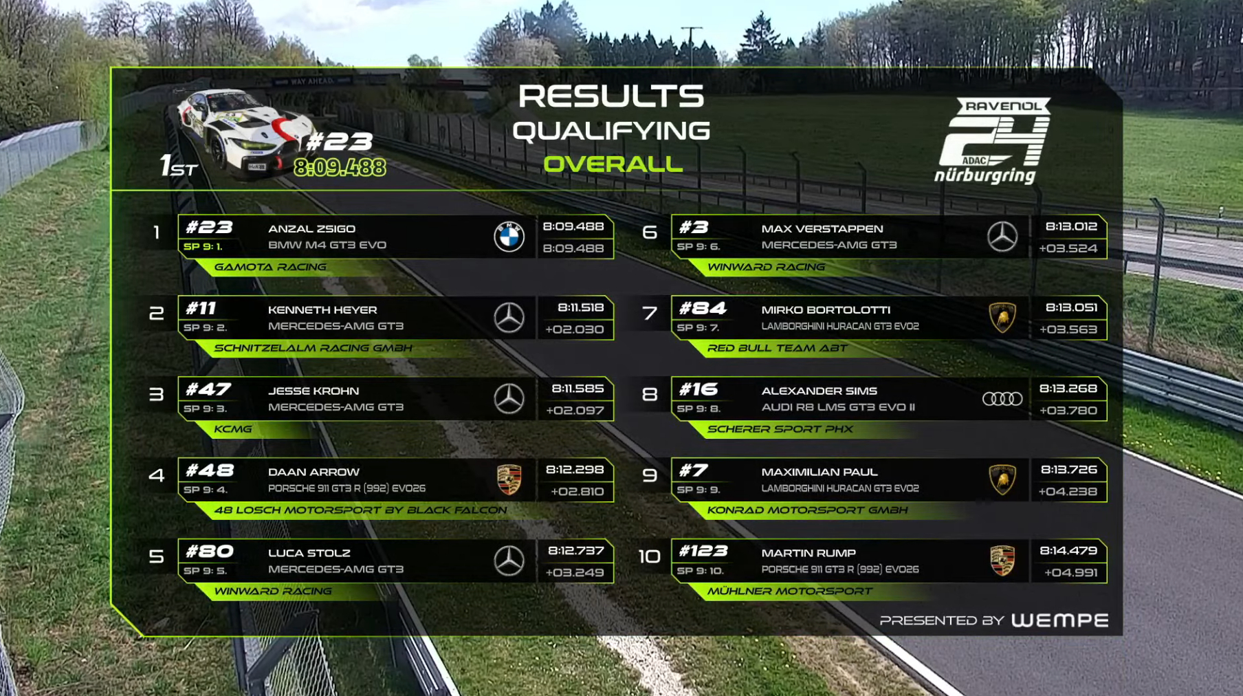 纽博格林24小时耐力赛资格赛第一回合排位赛结束,斯洛伐克车手安塔尔-齐戈驾驶23号宝马赛车跑出8:09.488夺得了杆位,11号和47号梅赛德斯分列二三。