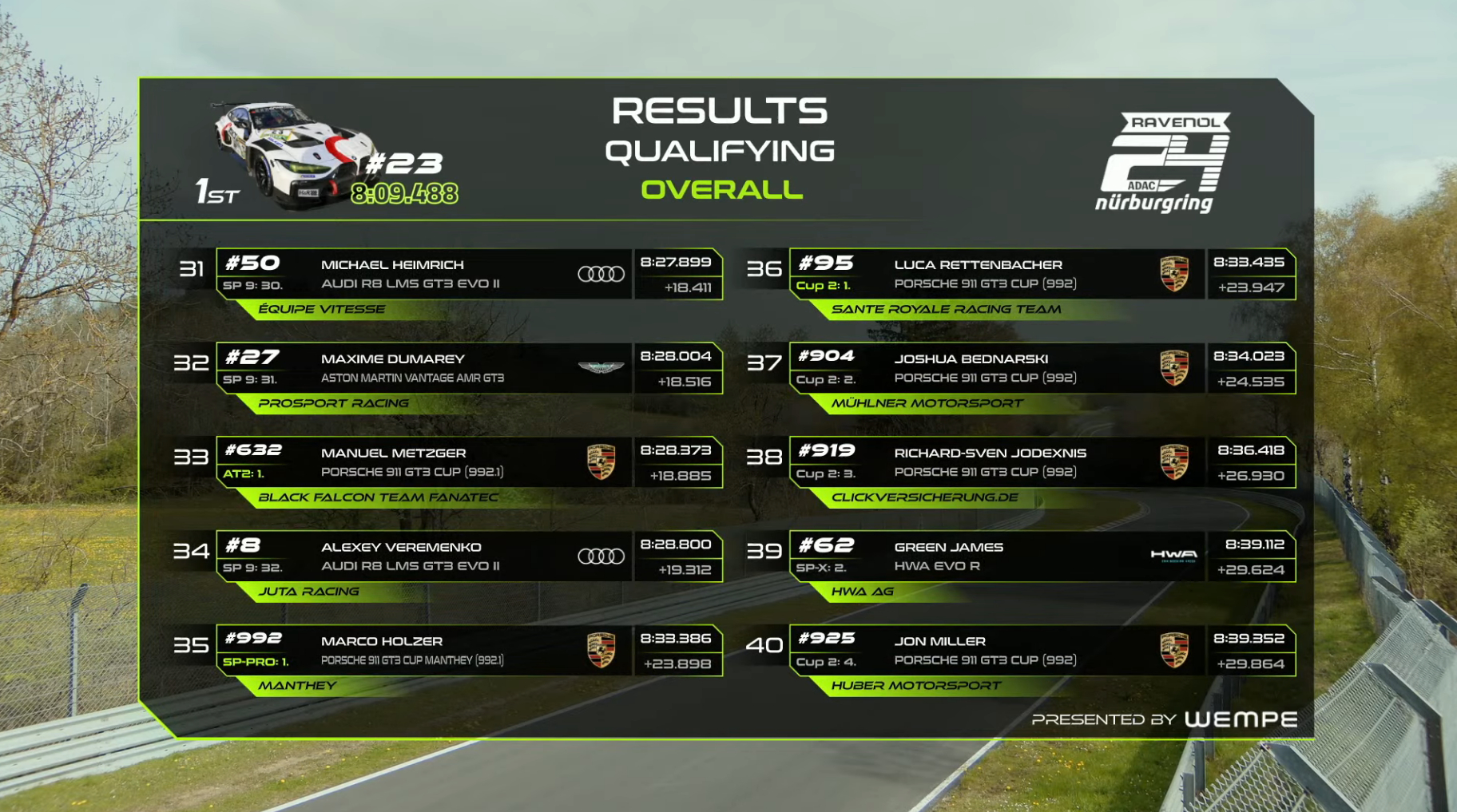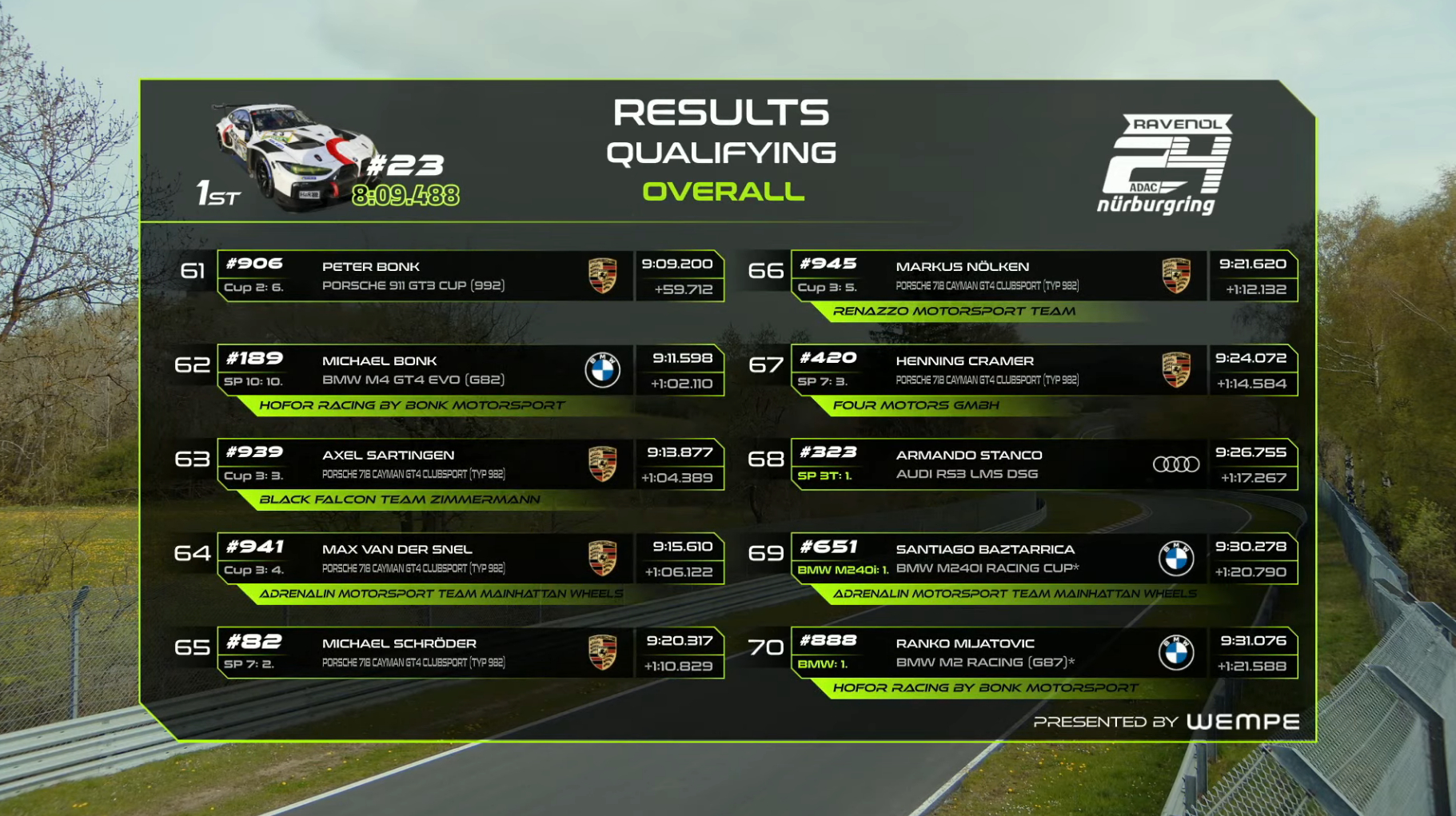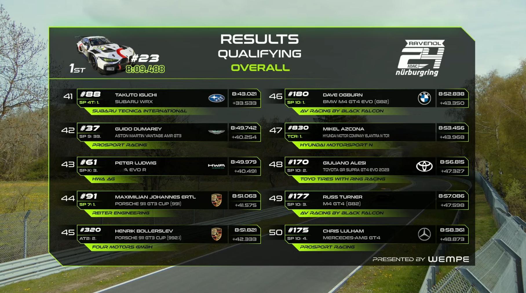 纽博格林24小时耐力赛资格赛第一回合排位赛结束,斯洛伐克车手安塔尔-齐戈驾驶23号宝马赛车跑出8:09.488夺得了杆位,11号和47号梅赛德斯分列二三。