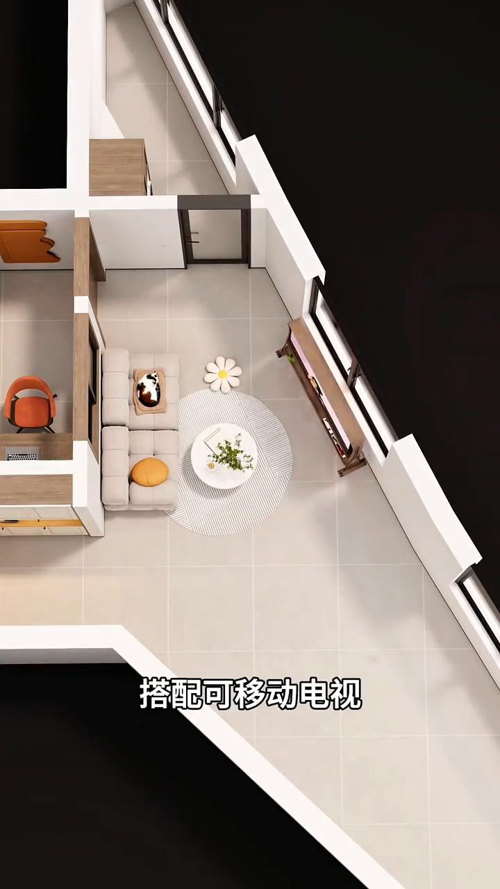 顶头角落做洗晒区,放入洗烘机组合,旁边还能做个小水池,衣服晾晒没烦恼。客厅放个法式小沙发,搭配可移动电视。旁边再做吧台餐桌,连接橱柜一体,放上电磁炉和大单槽水池,底下还能放个嵌入式小冰箱。再留出过道,做个干湿分离卫生间,外面做洗手池,里面做智能马桶和淋浴。再叫隔壁二舅砌一个浴缸,下班回来还能泡泡澡。