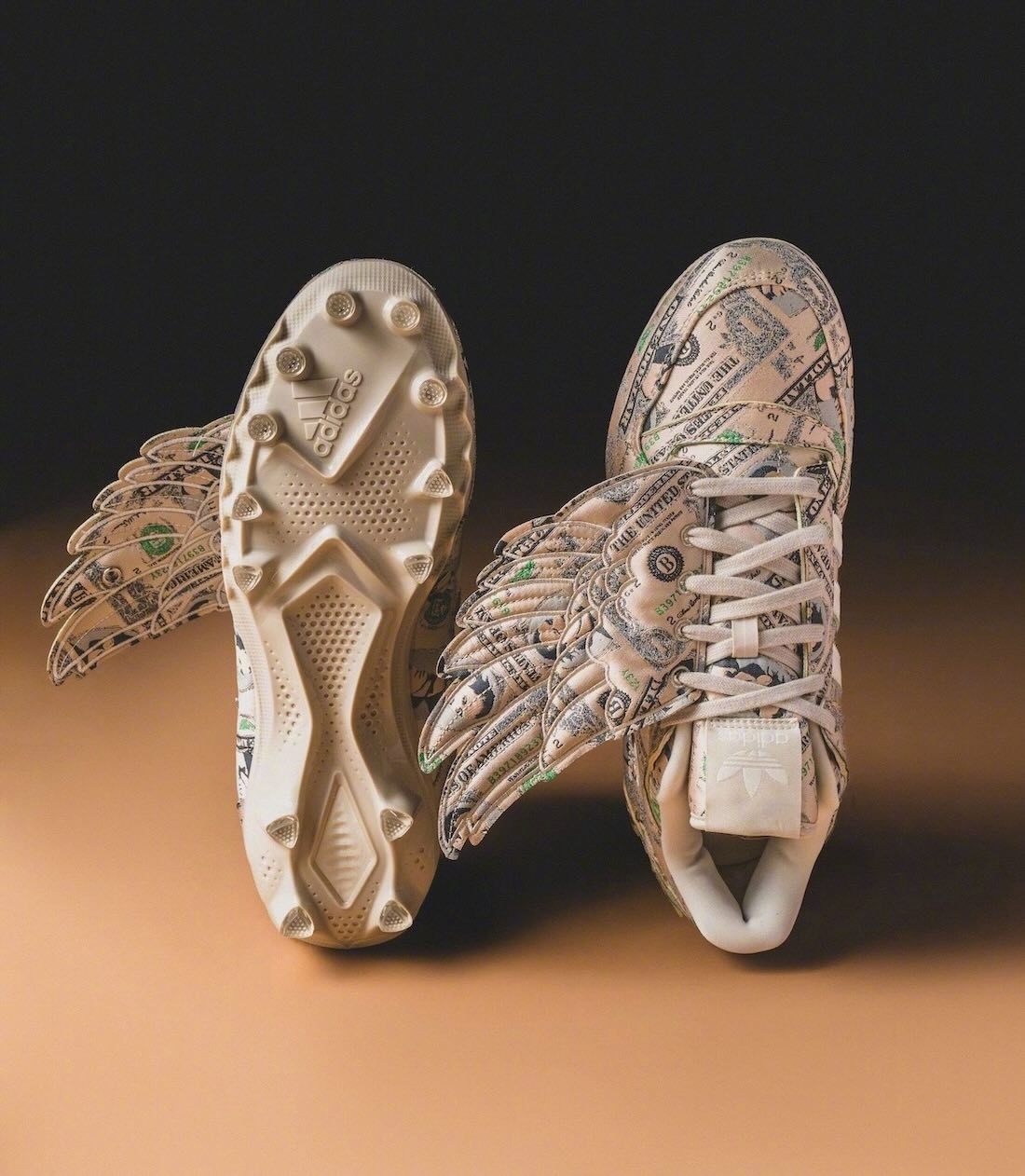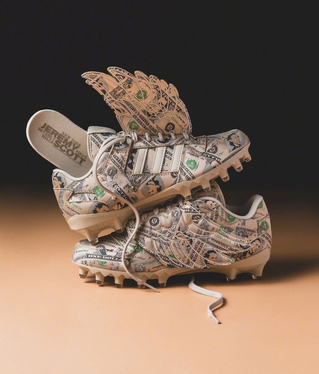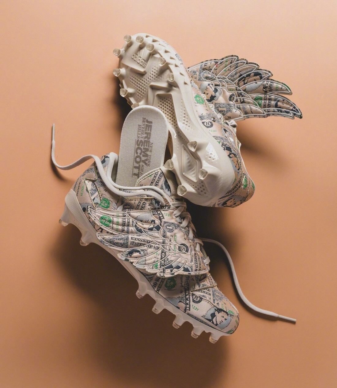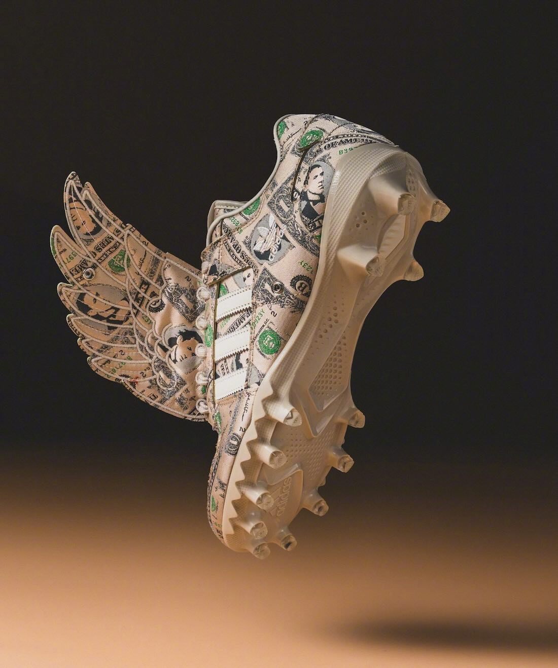 Jeremy Scott再再再次回归,以他经典的Forum「Money Wings」为蓝本打造的橄榄球钉鞋,带有Jeremy肖像的货币图案满印鞋面搭配经典飞翼元素💰🪽