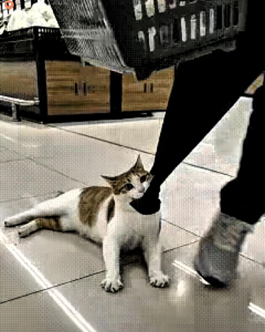 猫主子二话不说咬住大哥裤腿,生拉硬拽往猫粮货架冲,磨磨蹭蹭赖在货架前不走,小眼睛瞪得倔劲儿十足,摆明了不买就不走。