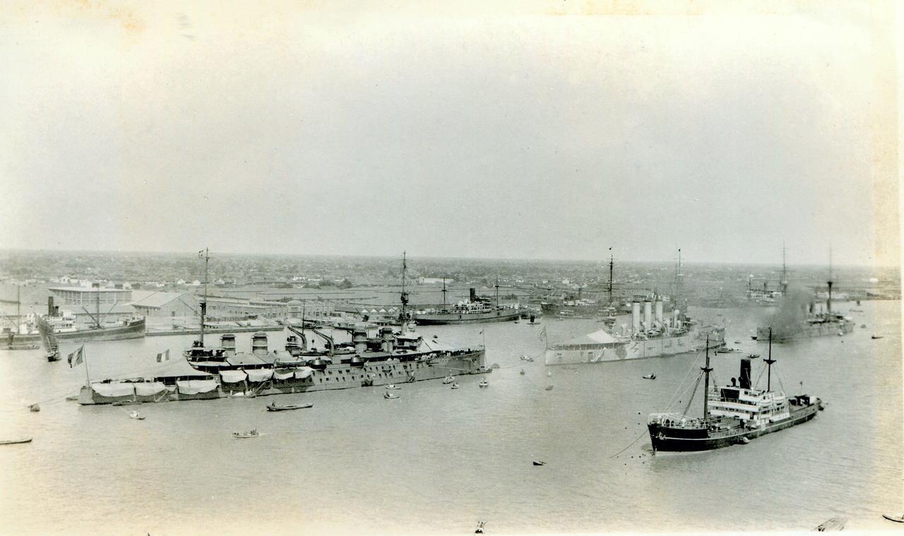 1925年黄浦江上的美日法三国巡洋舰。 从左往右分别为法国海军儒勒.米什莱号装甲巡洋舰、美国海军CA-9休伦号装甲巡洋舰,以及一艘未知名的日本巡洋舰(可能是出云号装甲巡洋舰)。民国历史 老照片 历史老照片