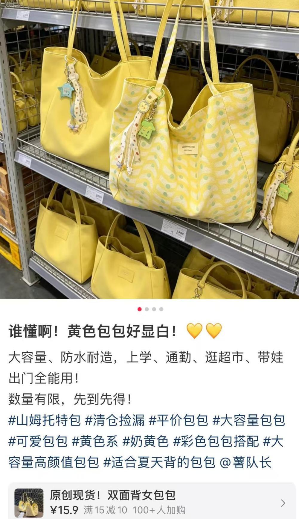 极目新闻记者留意到,网传包包有黄色、红色、紫色等多种配色,相关帖子带上“山姆托特包”“山姆同款托特包”“山姆超市好物”等热门话题,借此引流传播。