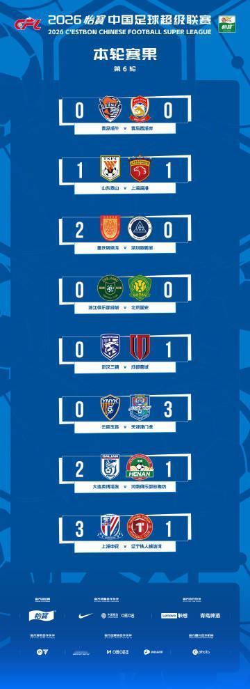中超第六轮比赛没太多意外。8场比赛共进15球,场均不足2球。其中主队3胜,客队2胜,平3场!