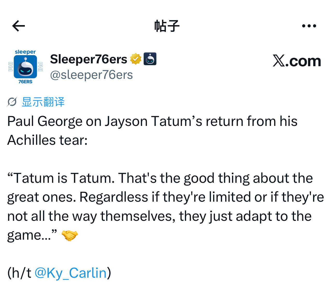 保罗·乔治在接受采访时,谈及凯尔特人队球星杰森·塔特姆跟腱撕裂伤愈复出🫡——“塔特姆就是塔特姆。这就是伟大球员的可贵之处。无论他们是否状态受限,或者是否完全恢复自我,他们就是能够适应比赛…”
