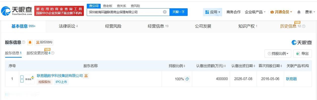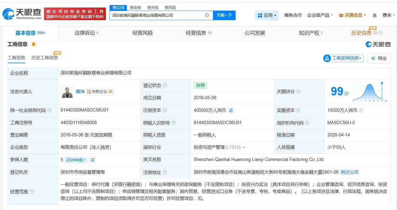 天眼查App显示,近日,深圳前海环融联易商业保理有限公司发生工商变更,注册资本由1.5亿人民币增至40亿人民币,增幅约2567%。