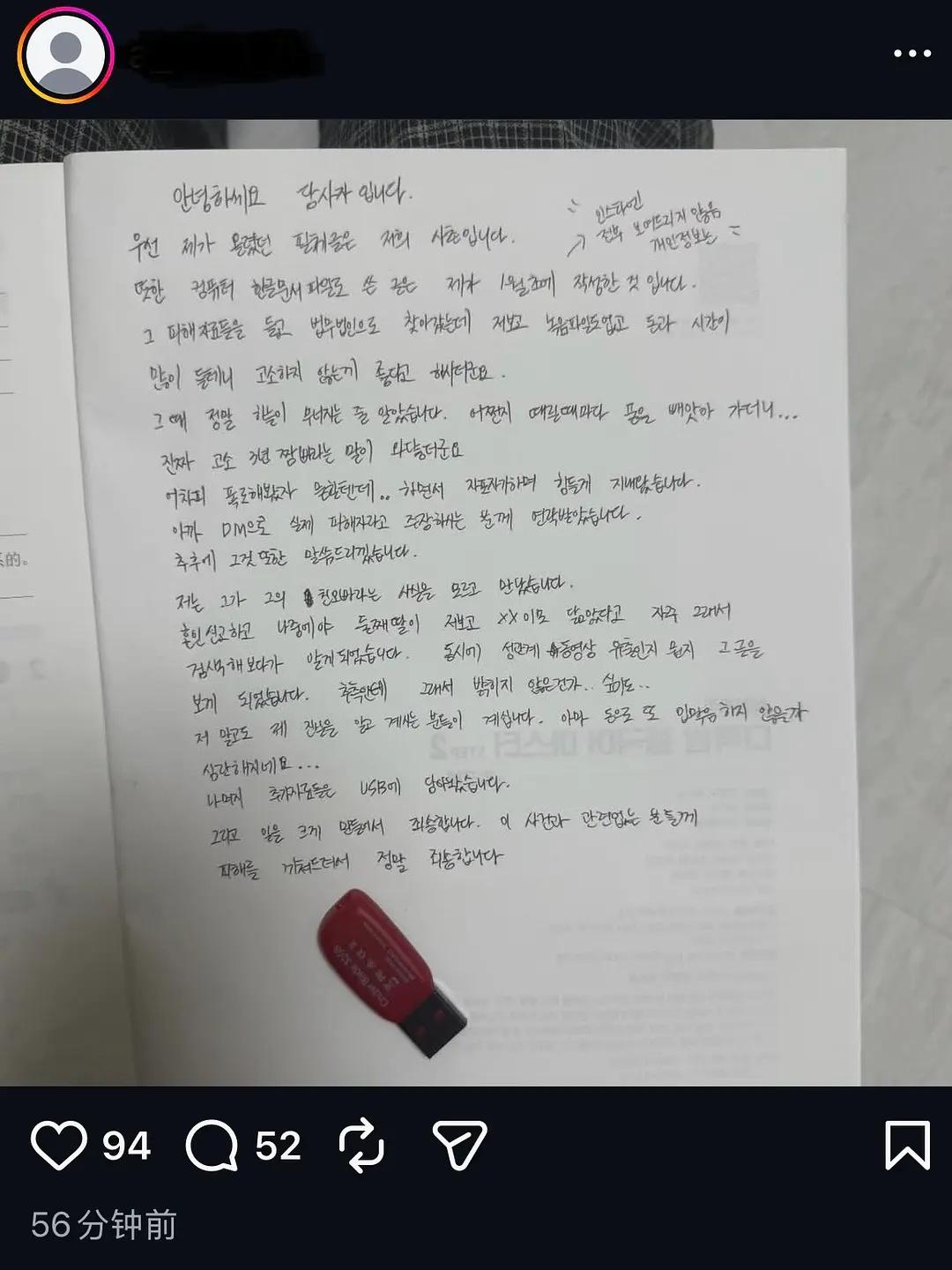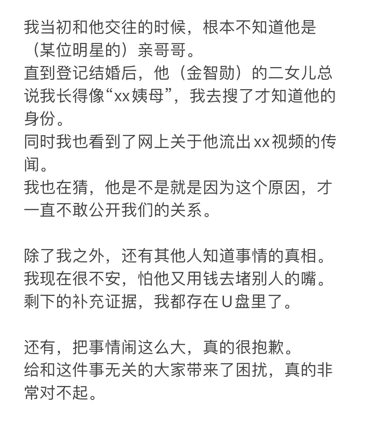 金智秀哥哥第二任妻子发文 省流:受害人和金正勋直到结婚时,都不知道他和金智秀有关