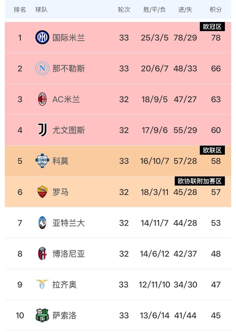 随着竞争对手的失利,国际米兰在联赛剩5轮下积分领先多达12分,国际米兰只需要再取得4分即可稳夺冠军,现在基本可以说意甲冠军已是国际米兰的囊中之物了。