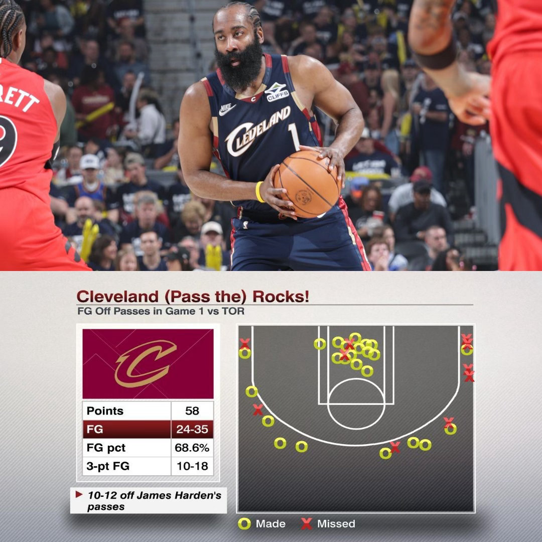 骑士vs猛龙G1比赛里,骑士队其他人接到哈登传球后合计12投10中,命中率高达8