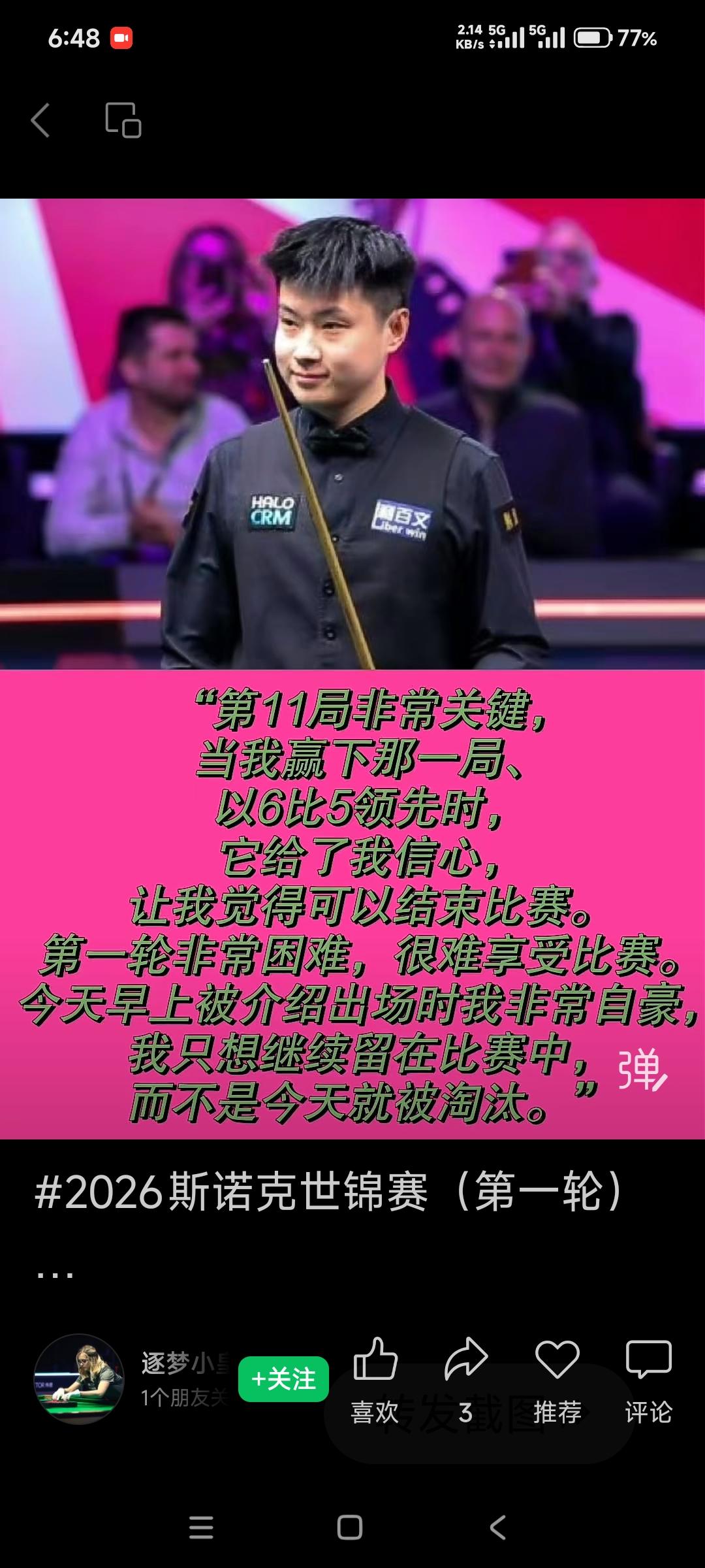深层解读赵心童世锦赛首轮赛后采访 结合下面两张图里赵心童的赛后采访发言,我们可以