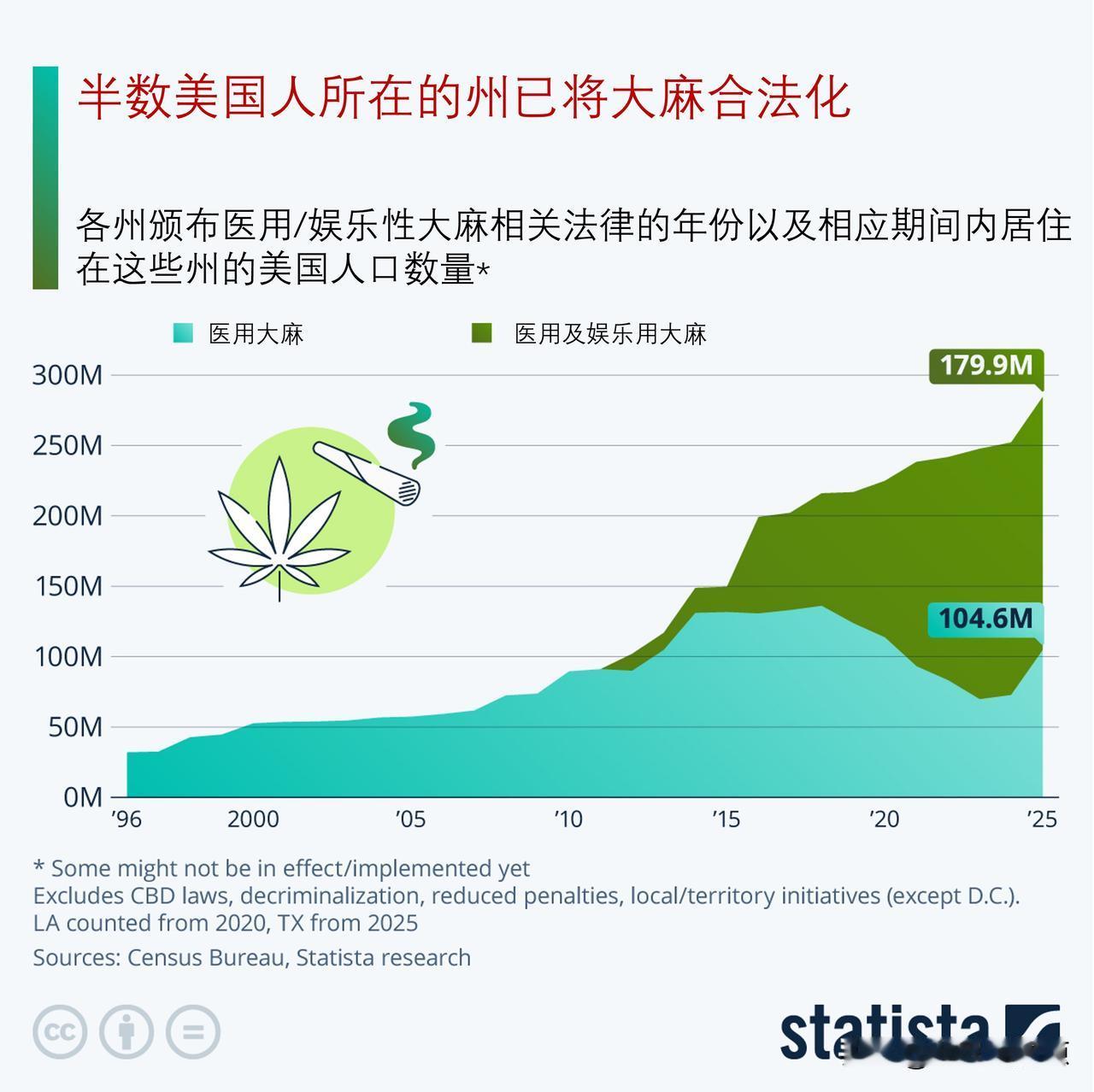医用大麻方面,2015年之后共有15个州通过了医用大麻公民投票或相关立法,包括宾夕法尼亚州、俄亥俄州、佛罗里达州、犹他州以及最近的内布拉斯加州;2024年选举期间,内布拉斯加州选民投票通过了此前已获州议会通过的医用大麻法律;2025年,得克萨斯州大幅扩大了其医用大麻法律的适用范围,就下面图表统计而言,该州现已被列为医用大麻合法州,这再次显著推高了受任何形式大麻合法法律约束的美国人口数量。