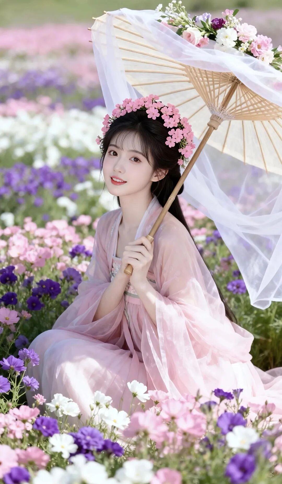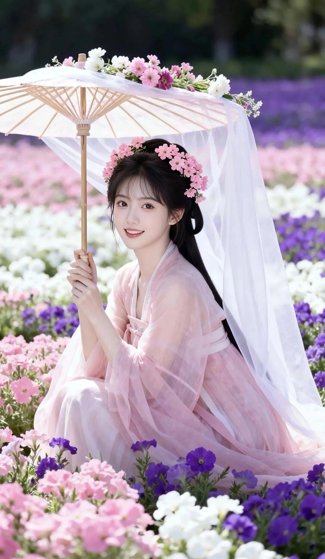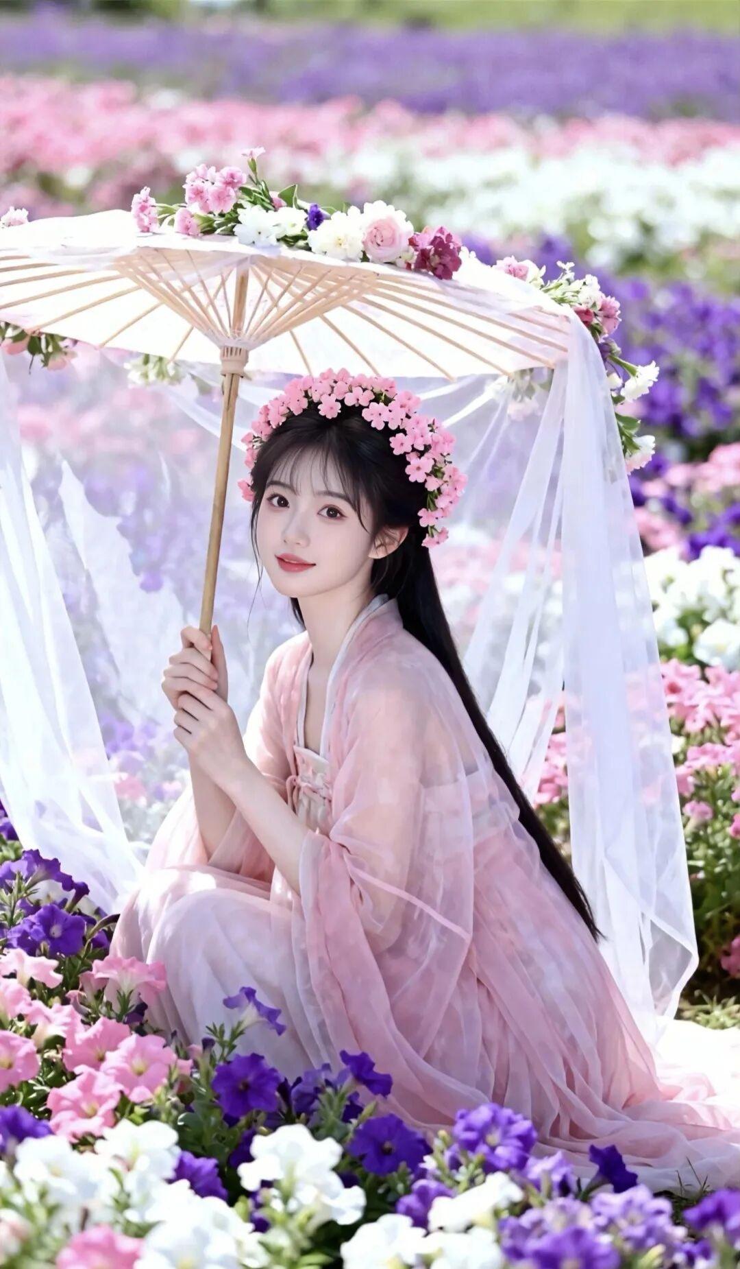这组照片是典型的春日汉服森系风格,粉紫白三色花海、浅粉色齐胸襦裙、带白纱的油纸伞,搭配花冠造型,整体营造出“花中仙子”的温柔意境,像从古风小说里走出来的春日美人。