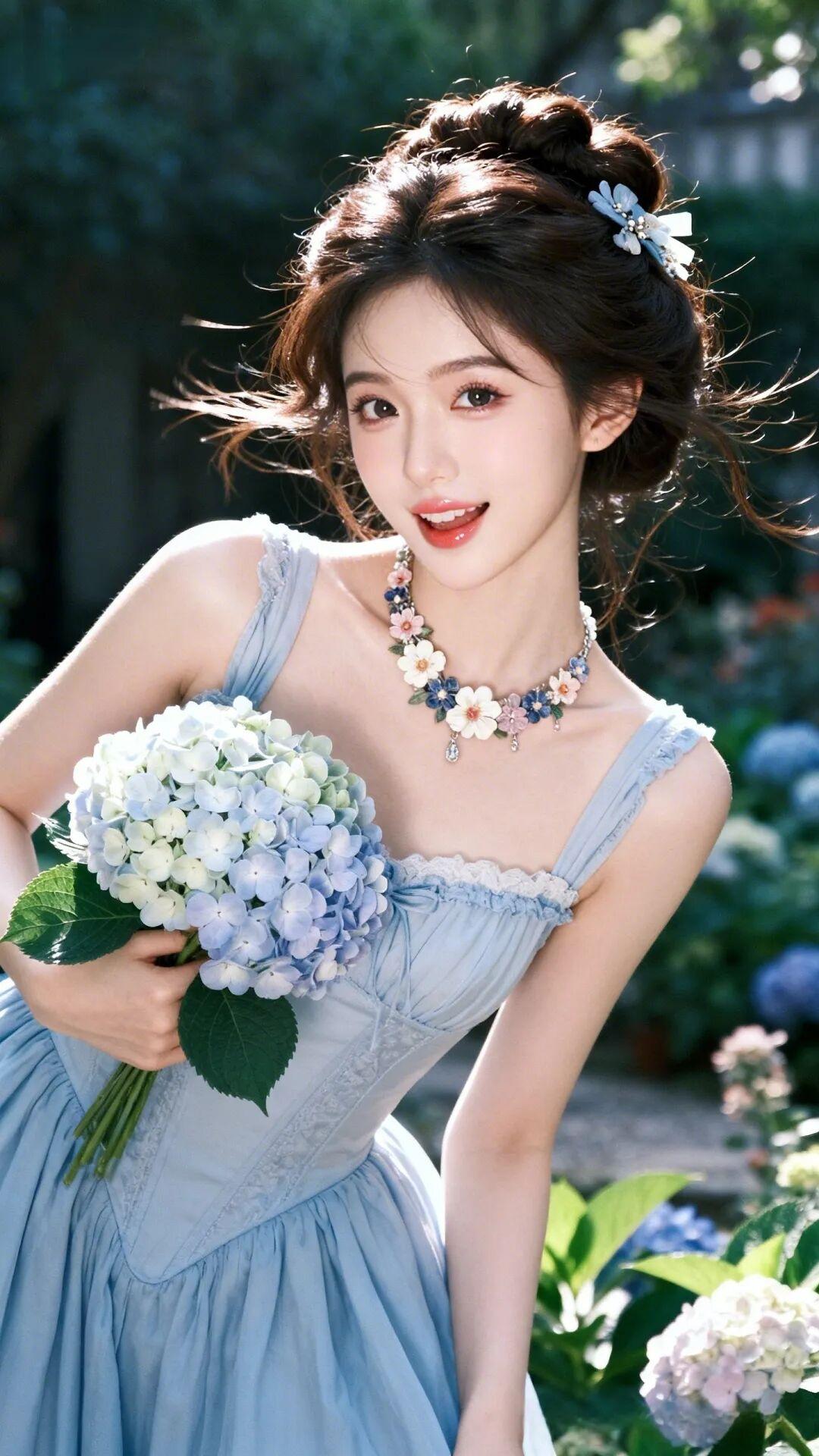 风格:梦幻浪漫的森系少女感,蓝色绣球花和浅蓝公主裙的搭配,像油画里走出来的少女。