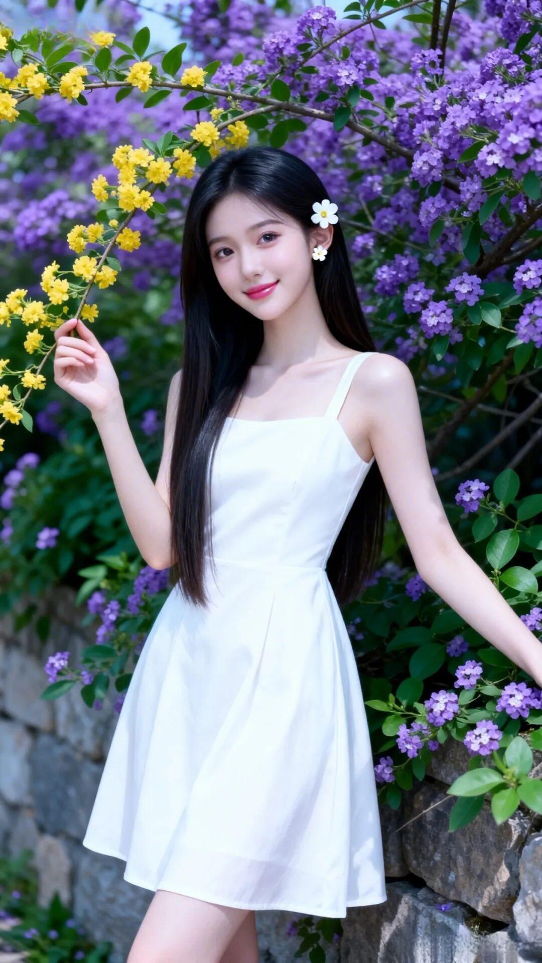 风格:清新灵动的少女感,背景的紫花黄花搭配白裙,像从春天的童话里走出来的一样。