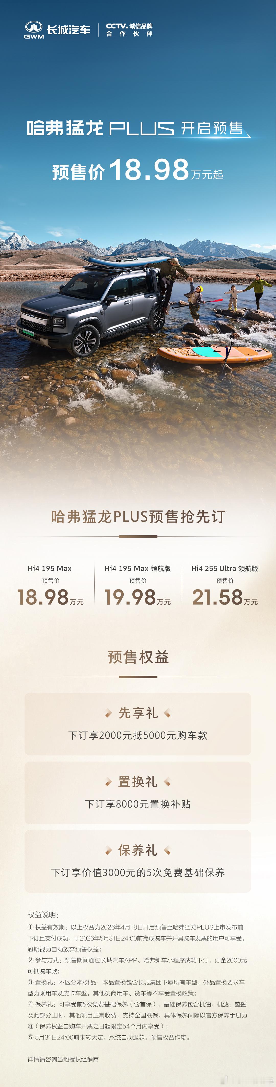 哈弗猛龙PLUS,18.98万元起的预售价,3款配置一步到位;还有Hi4智能四驱电混加持,兼顾城市通勤和轻越野户外出行。哈弗猛龙PLUS这次明显是“更懂中国家庭”了。在越来越卷的新能源市场里,猛龙PLUS不是花哨噱头,而是更实在的产品力和更清晰的场景答案。20万级家庭四驱方盒子SUV,这次热闹起来了。