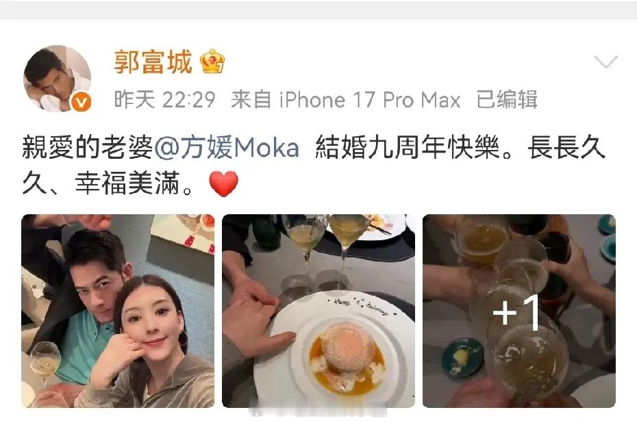 【郭富城庆祝和方媛结婚九周年郭富城方媛结婚九周年晒照】4月18日,发博庆祝和方媛