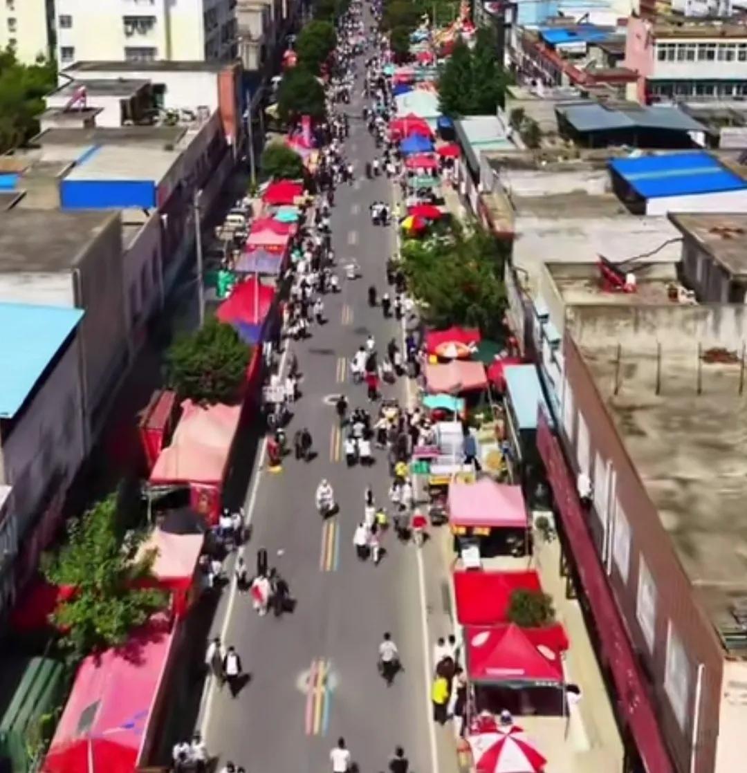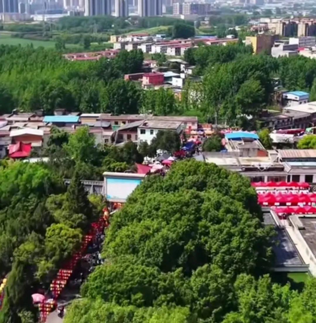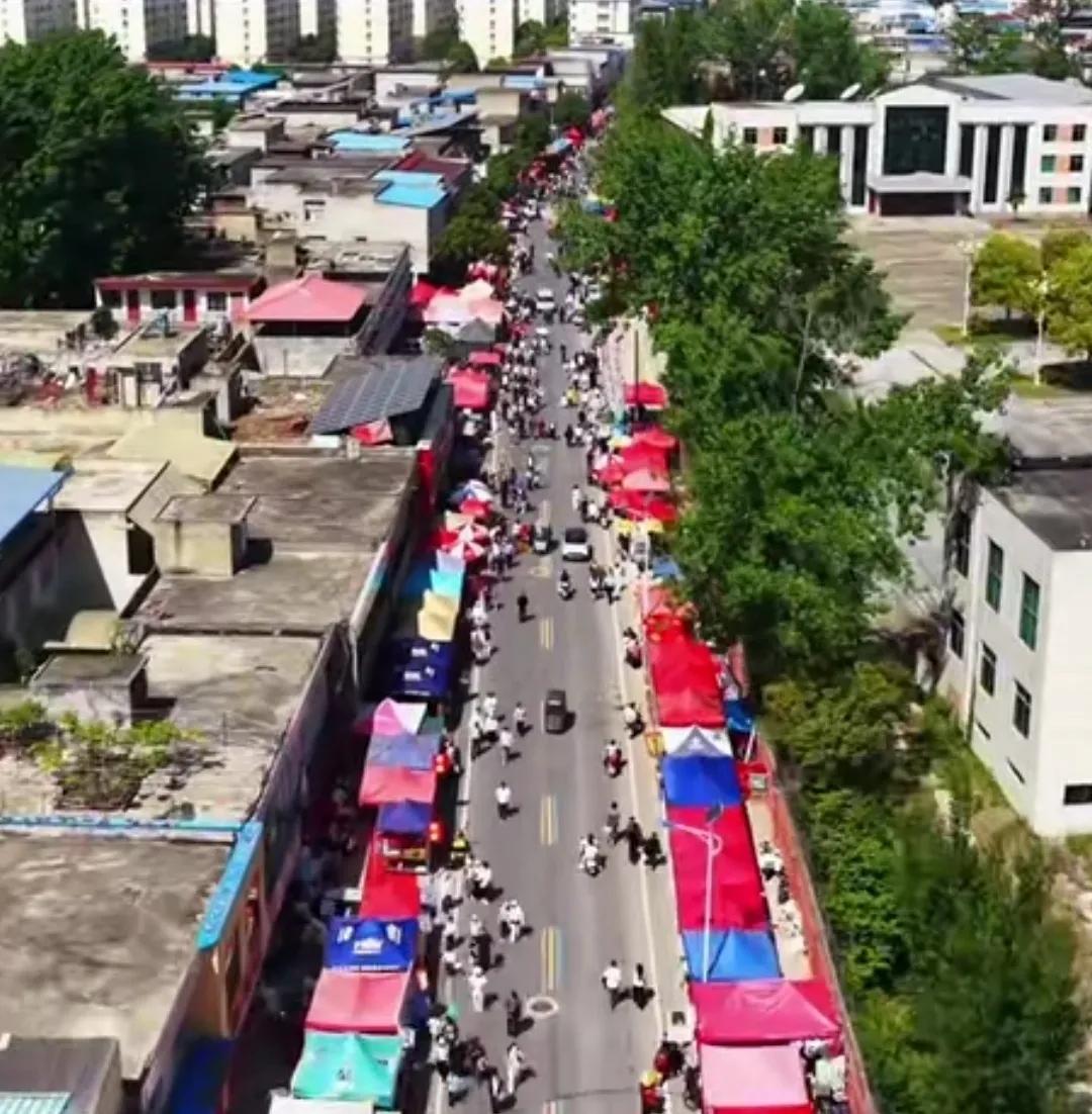4月19日上午,三月三,南阳独山庙顶上红星红旗飘扬,街道两边百货美食摊位密集,马