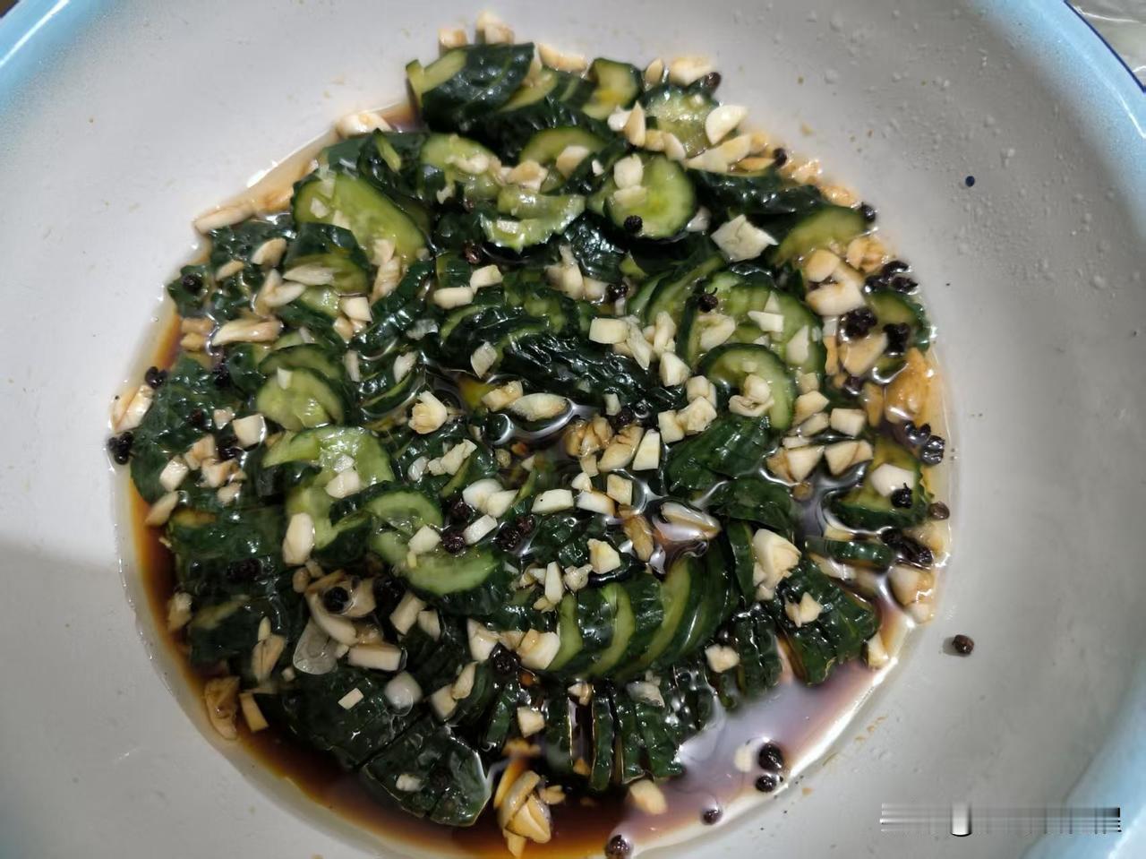 黄瓜切成螺旋状,盘在盆里用盐腌上,上面放个水盆更容易出汤。在碗里调个料,放生抽、醋、白糖,多切些蒜末,炸点花椒油,把腌好黄瓜里的水控尽,放上所有的腌料,盖好放冰箱储存,转天就能吃了,清脆爽口,当配菜吃挺好的。因为不敢吃辣没放辣子,爱吃辣的炸上几个小辣子放里更好吃!😋