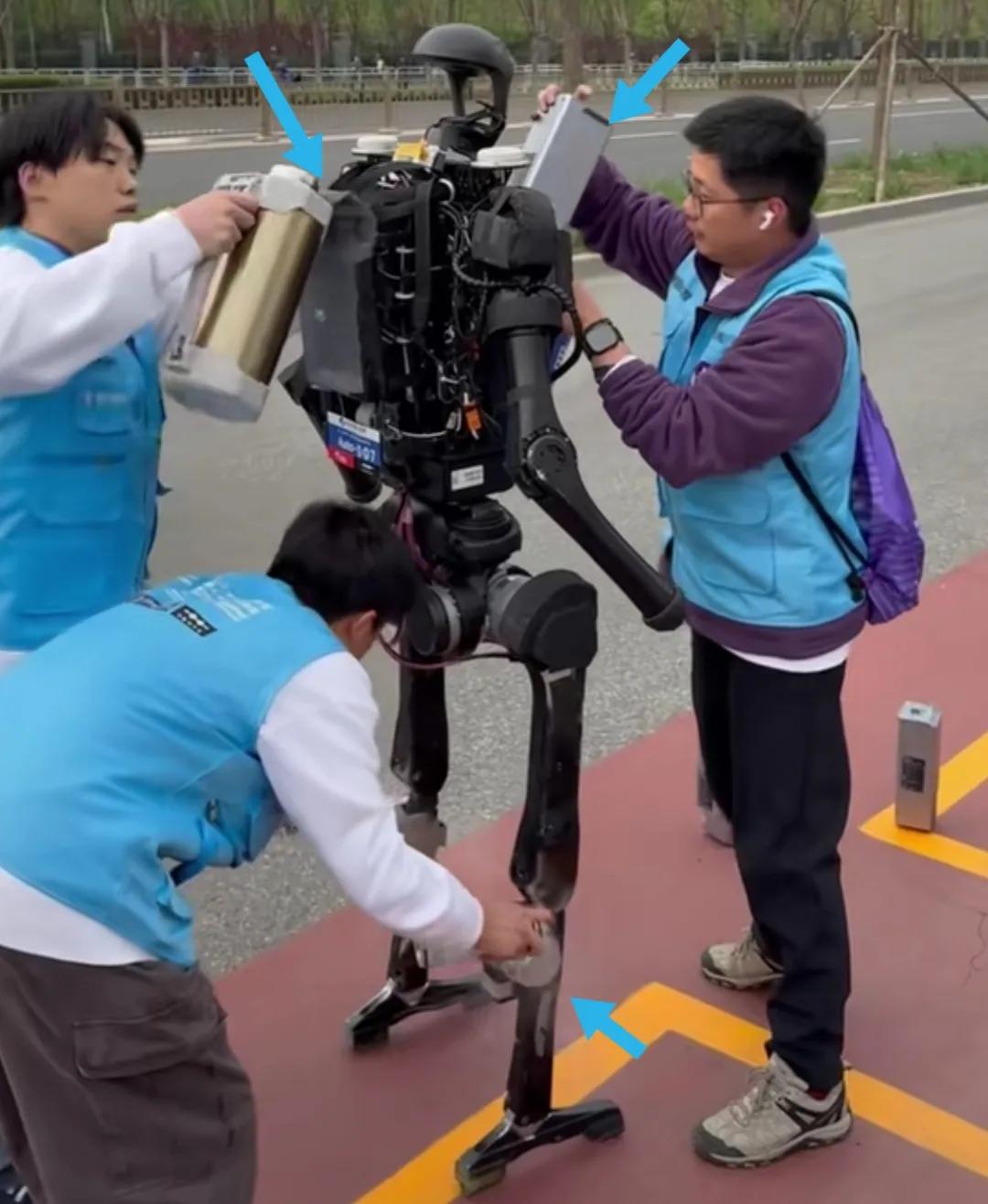 马拉松赛跑中途给机器人补给,科技创造新动力。