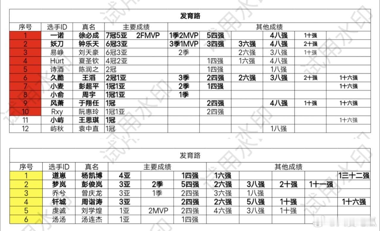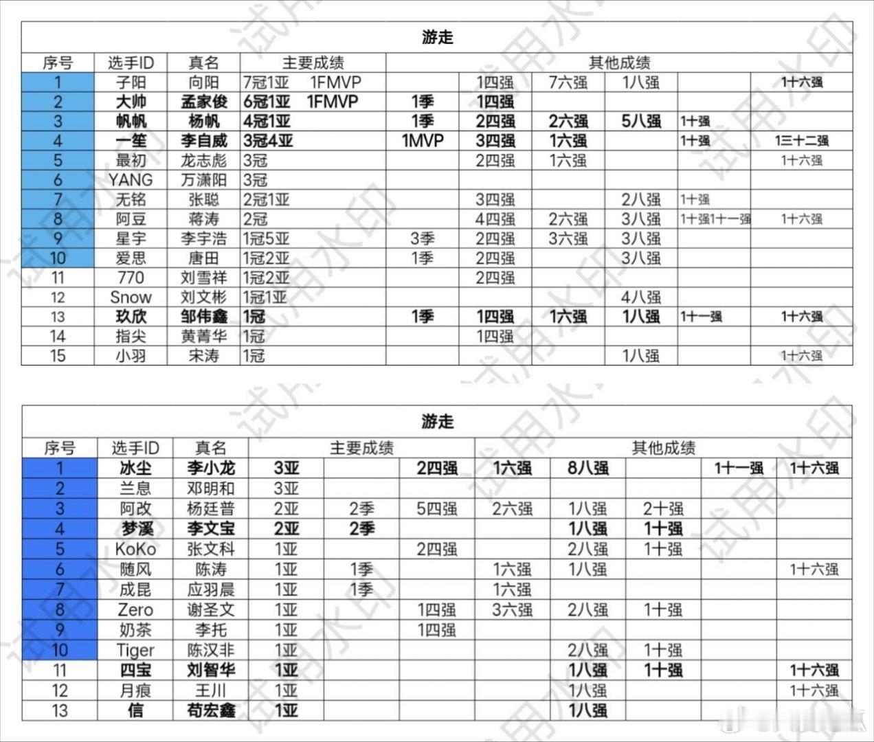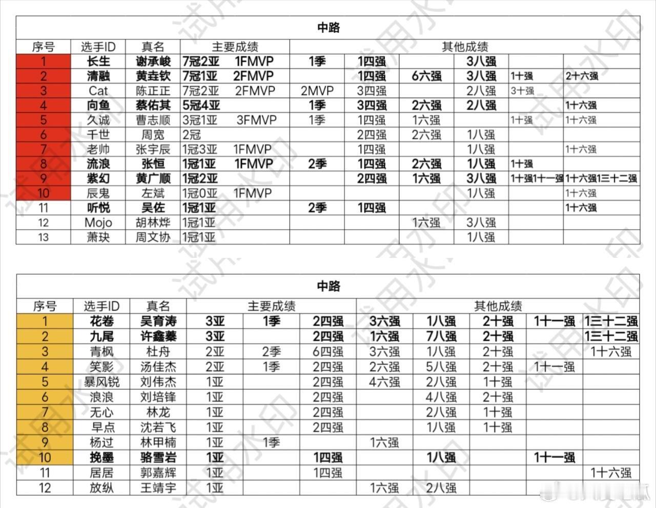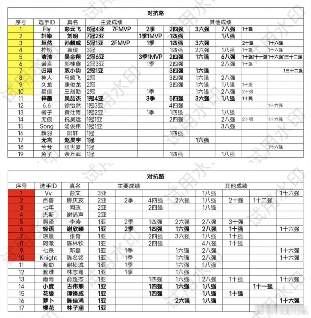 同一名选手只上榜一条分路,上榜选手写的都是他生涯的成绩, 不代表他这一条分路的成绩,