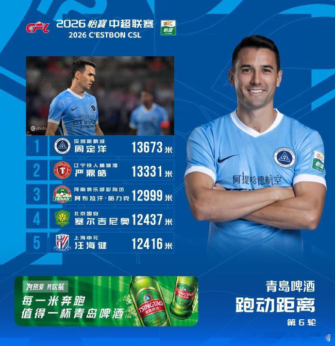 辽宁铁人严鼎皓 第6轮比赛中,辽宁铁人传球成功率87%,排名第3名;严鼎皓跑动距离13331米,排名第2名。
