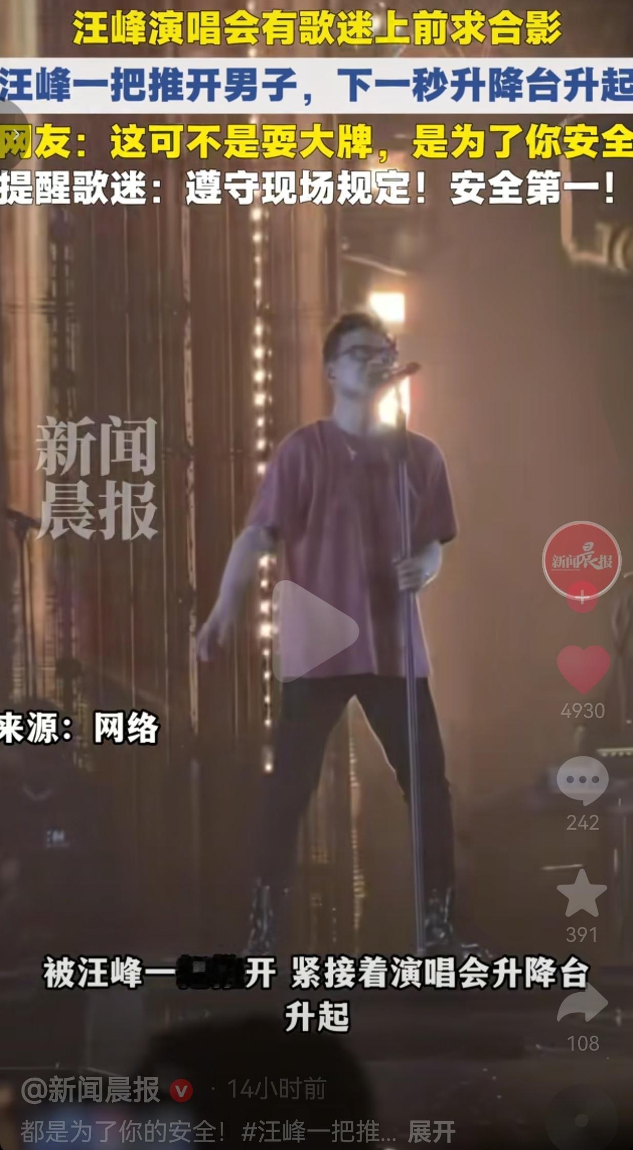 有的网友说:“我就在前排!当时看那歌迷冲上去,心都提到嗓子眼了!升降台都亮灯了马上要升,汪峰反应真快,再晚一秒,那男的要么被台带上去,要么直接被夹住发生意外,这哪是推人,这是救命啊!”