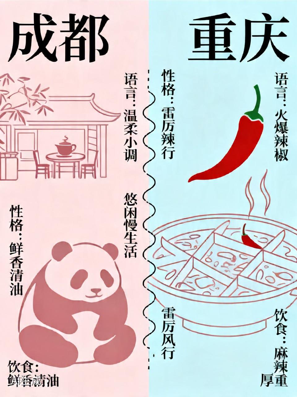 成都人和重庆人有什么区别? 成都人和重庆人,那区别还挺明显。先说说话,重庆话像火爆辣椒,干脆直接,音调高亢,比如“你啷个楞个嘞”,一听就火辣辣的。成都话则像温柔小调,软糯婉转,“你咋个回事嘛”,多了几分柔和。