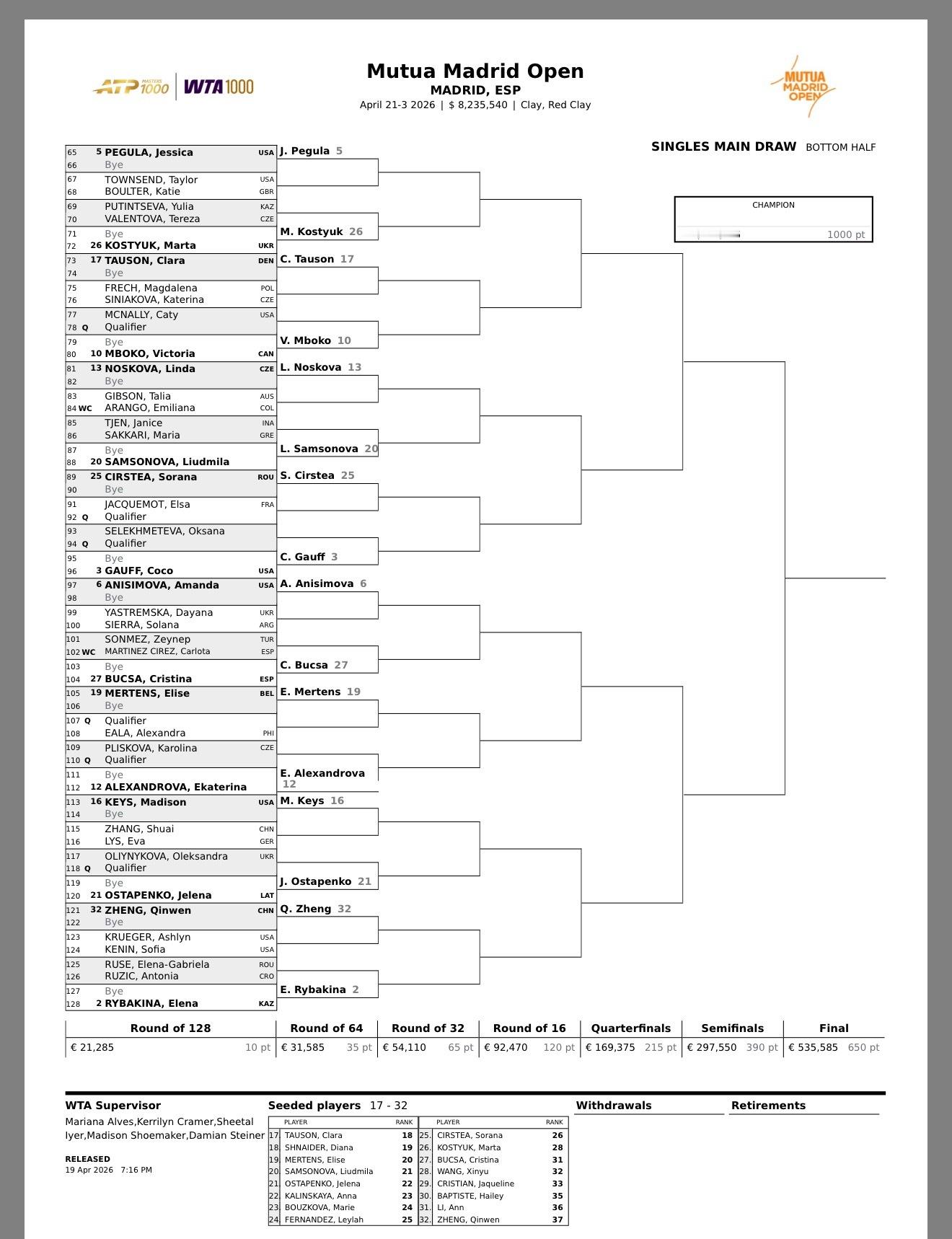 网坛风云 马德里1000赛公布单打正赛签表,萨巴伦卡、莱巴金娜领衔上下半区,王欣瑜28号种子首轮轮空,第二轮带概率对阵玛丽亚;郑钦文32号种子首轮轮空,第二轮将面对克鲁格和肯宁的胜者,对位大种子莱巴金娜;张帅将在首轮对阵德国美女利斯。wta