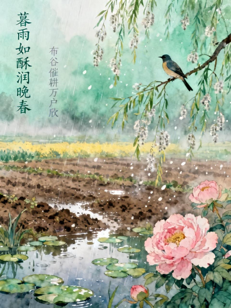 今日谷雨 暮雨如酥润晚春, 桑间戴胜唤丝勤。 牡丹绽艳倾国色, 布谷催耕万户欣。