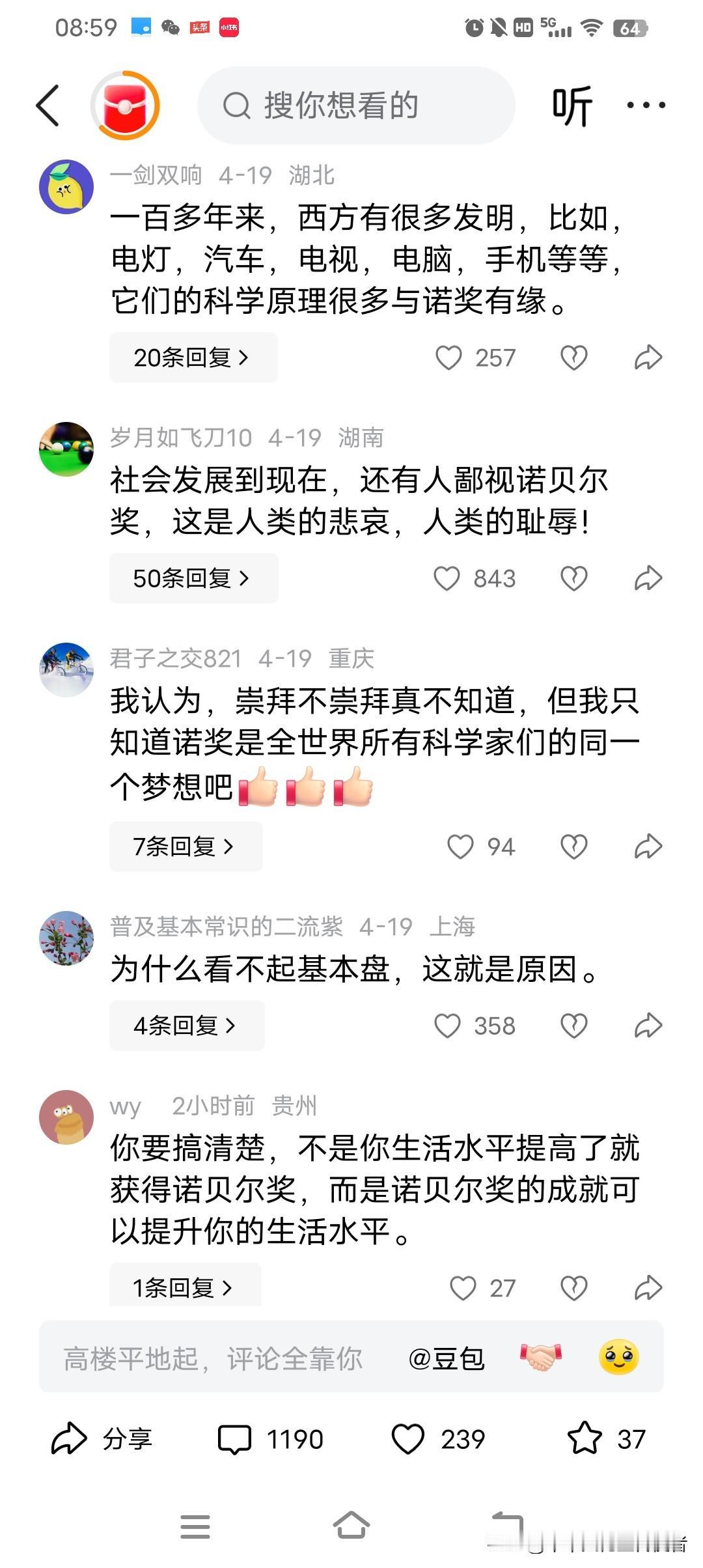 说了个不要太崇拜诺贝尔奖。好家伙,1000多人排队来骂我,说享受着人家的科技成果,还有脸说这话?!那我想问一下,他们的科技成果是平地来的吗?他们在谁的基础上发展的,难道不是以中国的科技为基础来的吗?